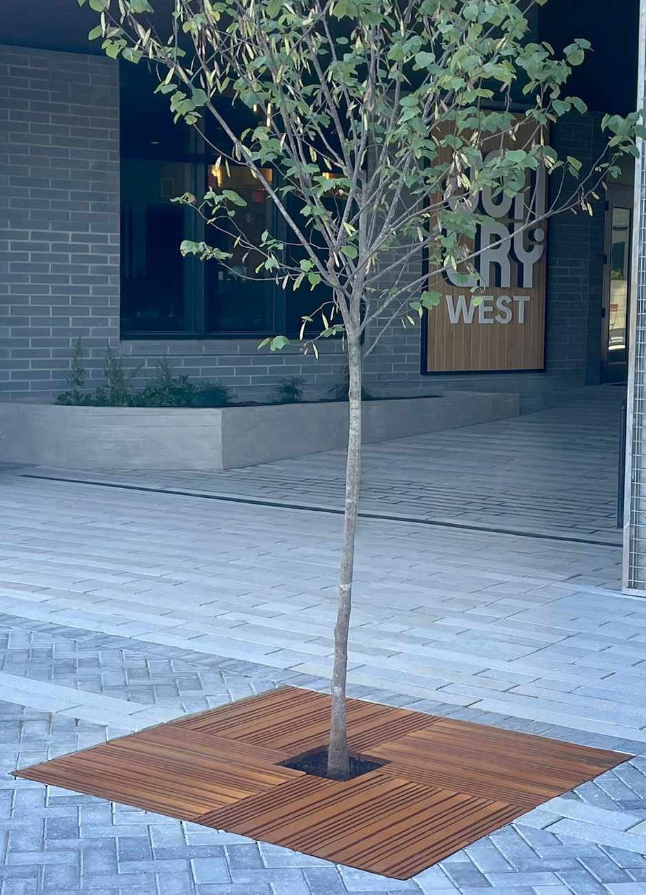 The Que combines the clean, simple lines of a traditional slotted grate with the surface interest and refinement inherent in all our cast metal designs. This heel-proof tree grate is shown in newly installed raw cast iron. Made in the USA.