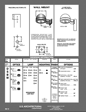 Half domed, round luminaire with integrated arm. Large DSB Series luminiare available up to 400 watts max HID.Extruded arm, optional wall mount bracket. Hinged door frame with thumbscrews for easy access. "Instaleze" ballast tray, wiring, and/or access features for ease of installation and maintenance.Heavy gauge cast aluminum body and integrated arm. Formed aluminum top and door frame. Stainless steel hardware. Polyester powdercoat finish.