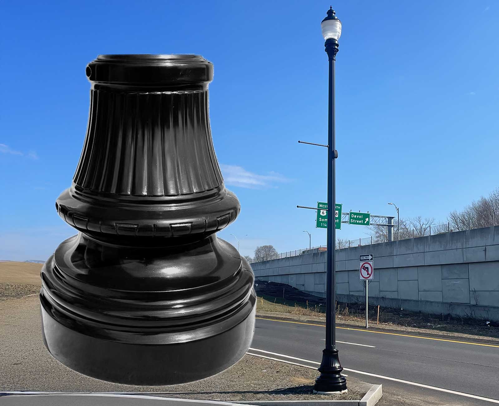 Made of color through resin material which is armed with sun repelling UV inhibitors, this base is constructed to withstand years of sun and salt without the need for painting. This clamshell construction is designed for ease of installation and quick access, without the need for an access door. The base is approximately 11.88″ tall with the base diameter of 28″. This design accommodates a pole with up to 20.5″ diameter.