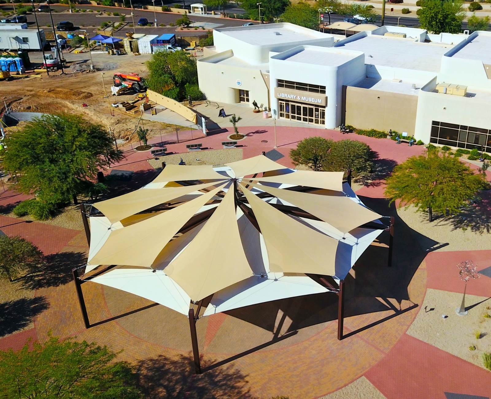 This custom-engineered shade solution integrates hexagon windmill shade structures with flat panel double cantilever systems to provide comprehensive coverage across a high-traffic aquatic facility. Designed to balance architectural impact with functional performance, the combination delivers both focal-point shade and continuous linear coverage throughout the space. The hexagon windmill structures create visually striking shade zones over key seating areas, using a radial configuration that promotes airflow and enhances stability in open environments. Their elevated form provides consistent sun protection while maintaining clear sightlines and an open, inviting atmosphere around the water. Complementing these, the flat panel double cantilever systems deliver efficient, uniform shade along walkways and adjacent seating areas. Their extended reach maximizes coverage while minimizing obstructions, supporting smooth circulation and improving comfort for guests moving throughout the facility. Together, these systems reduce surface temperatures, limit direct sun exposure, and enhance overall usability of the space. Constructed with durable, commercial-grade materials, they are engineered for long-term performance in demanding aquatic environments, making them an ideal solution for waterparks, community pools, and recreational destinations.