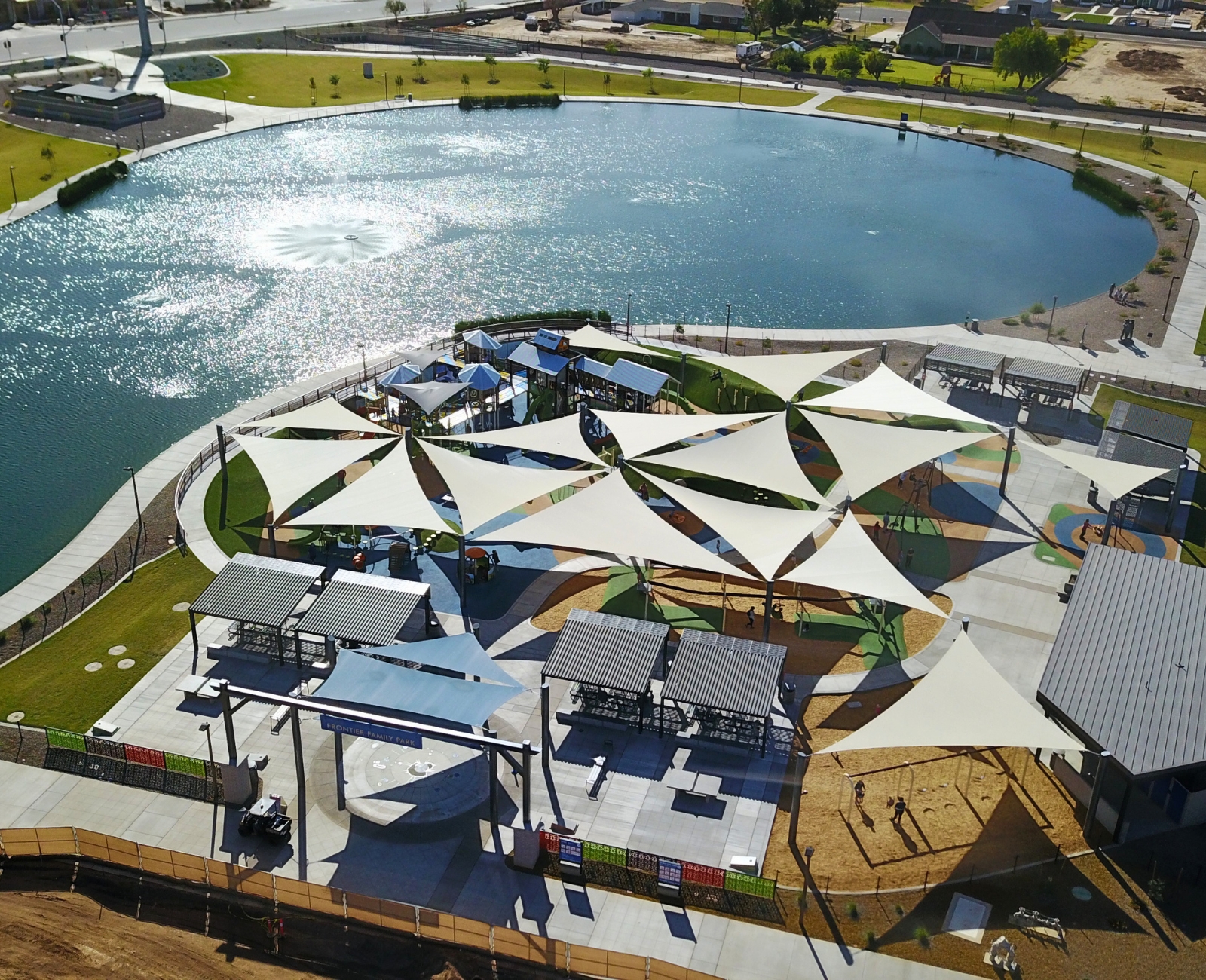 This custom-engineered Multi-Sail Shade Structure System provides expansive shade coverage across a high-traffic waterfront park and playground environment. Designed as a coordinated arrangement of individual tensile fabric sails, the structure creates a visually dynamic canopy while maintaining clear separation between each element. The multi-sail configuration allows for targeted shade placement over play areas, seating zones, and circulation paths, delivering effective UV protection and reducing surface temperatures throughout the space. The distinct sail forms introduce rhythm and movement, casting dynamic patterns of light and shade that enhance the overall user experience. Engineered with durable, commercial-grade materials, the system is built to perform in demanding outdoor environments while maintaining long-term structural integrity. The open design promotes airflow and preserves visibility across the site, ensuring the space remains comfortable, safe, and inviting for families and visitors. Ideal for parks, playgrounds, and community gathering spaces, this multi-sail system enhances usability while contributing a clean, modern architectural aesthetic to the landscape.