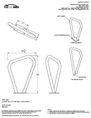 The Madrax Lofty™ Rack's form and function plays on multiple planes while providing the bike with secure, upright locking. Each Lofty™ Rack parks two bikes. The Lofty™ Rack is constructed of 2 3/8" OD Steel Tube and is available in a Galvanized Finish, a wide variety of Powder Coat colors, and stainless steel.