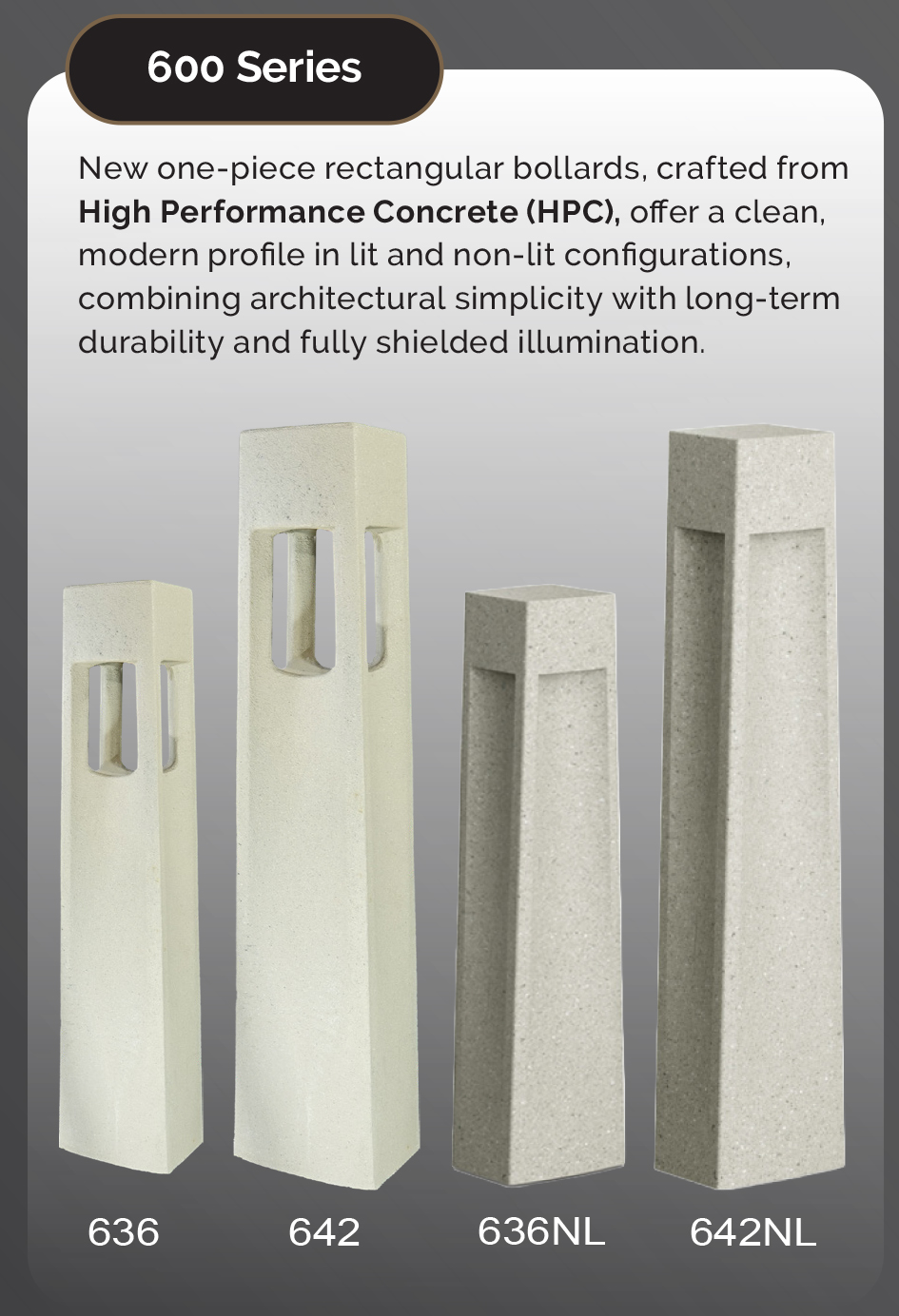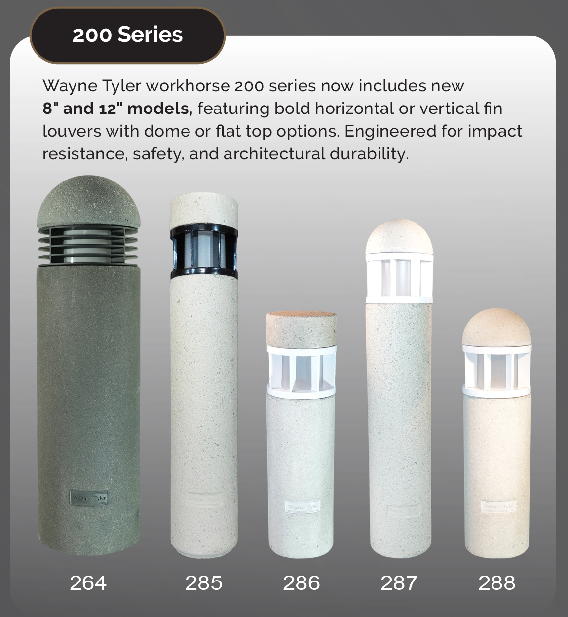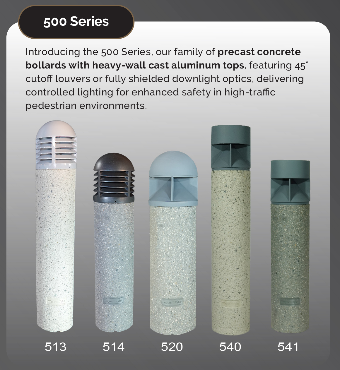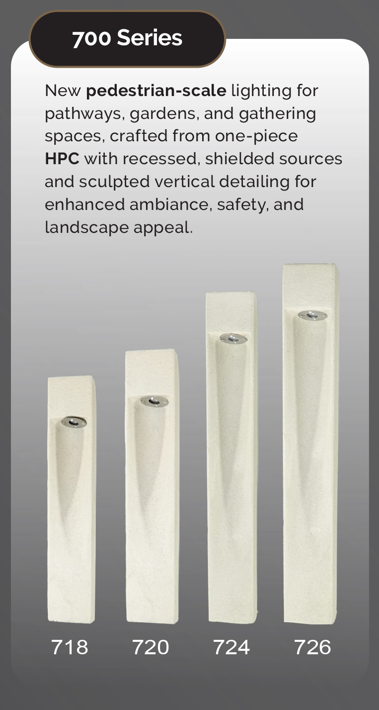 Wayne Tyler, designing and manufacturing high quality architectural concrete lighted bollards. -Durable concrete lighted and matching non lighted bollards. -Site hardening options available. -6 standard concrete colors and 4 standard concrete textures. - Custom colors and textures available.