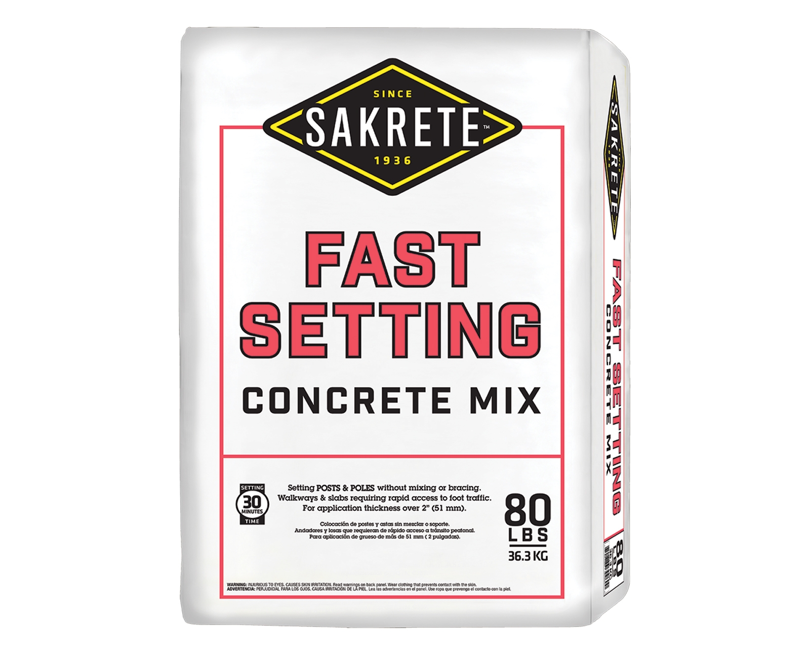 Sakrete's Fast Setting Concrete Mix sets in approximately 30 minutes, resulting in same day use. It also offers high strength, making it ideal for various applications including setting posts, poles, slabs, stairs and ramps. It is ideal for structural applications requiring a small volume of concrete.