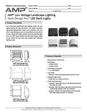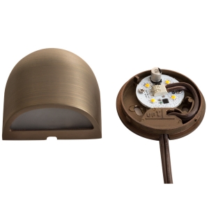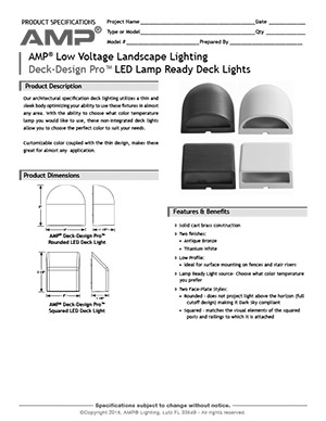 The AMP® Deck-Design Pro™ Rounded LED Deck Light is an attractive solid cast brass fixture that features a rounded shape similar to cylindrical garden bells or rounded posts. Like all AMP® LED deck lights, this fixture does not project light above the horizon (full cutoff designation) making it Dark Sky compliant. The region of illumination is semi-circular and extends outward with even distribution and soft edges. Lamp-ready configuration accepts G4 bi-pin lamps (sold separately)