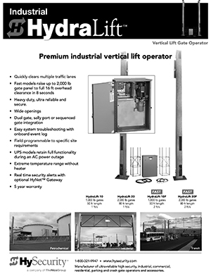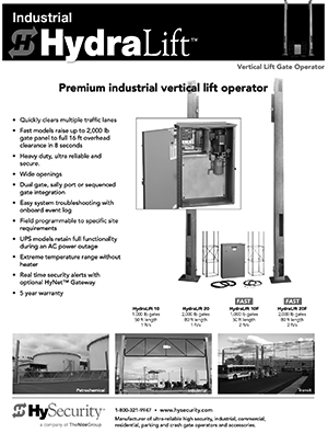 HYDRALIFT is a powerful, continuous duty, industrial grade vertical lift gate operator that clears multiple traffic lanes quickly. Well suited for snow/ice conditions and sites where additional space for swing or slide gates is unavailable. UPS models keep critical gates running during a power outage. This reliable operator locks securely and houses hydraulics and electronics in a remote enclosure.