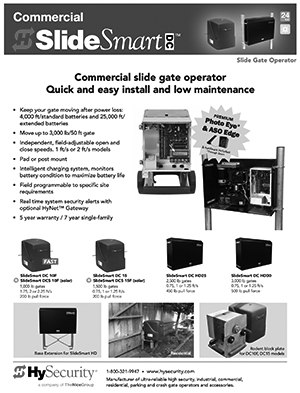 SlideSmart DC keeps your gate moving even after AC power loss. This commercial grade, continuous duty, electromechanical, chain driven slide gate operator is designed for millions of low maintenance cycles.