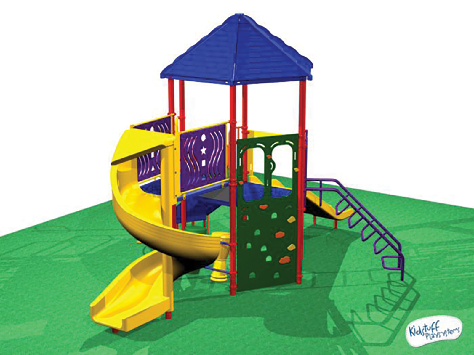 Playsystem #6152 IPEMA certified. This top selling playsystem has a huge hex-shaped platform, spiral slide, side-by-side slide, 3 great climbers and ADA transfer station.