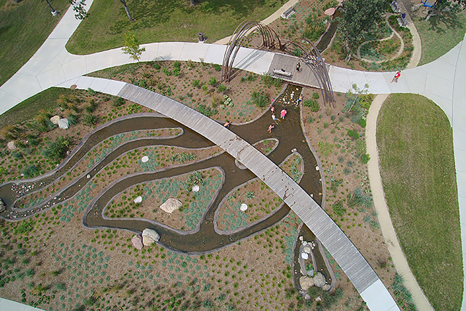 The City of Altoona, Wisconsin, turned to Modular Trail Structures to design and build a unique boardwalk solution for a large park development project along the Eau Claire River. The city aimed to blend urban aesthetics with the beauty of the riverfront. One of the city's primary goals was to have no sharp angles but rather a smooth, continual flow of the park path. Modular Trail Structures designed and built a perfect radius boardwalk, bending the steel to achieve smooth lines and centering the footings underneath the frames so they were hidden. The path also included two H5-rated free-span bridges that cross over the man-made stream flowing through the park.