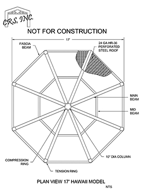 The Island shade structure model is a series of single-post park structures evoking a relaxed, South Pacific feel, without relaxing on the exacting needs of your project. Structures can be built to withstand 120 mph wind loads, and the legendary heavy-duty construction guarantees years of maintenance-free use. Variety of designs: four, six and eight-sided roofs available. An excellent complement to pools and water features. Heavy duty tubular steel fascia. Measured outside to outside of fascia (flat sides). Nearly any size is available both standard and custom.