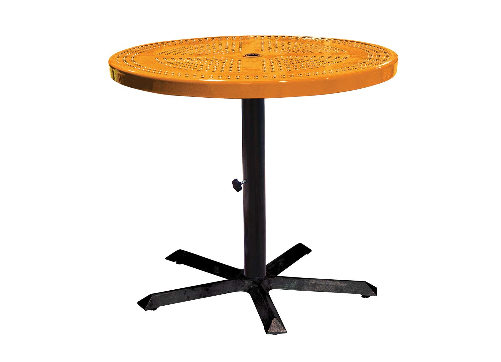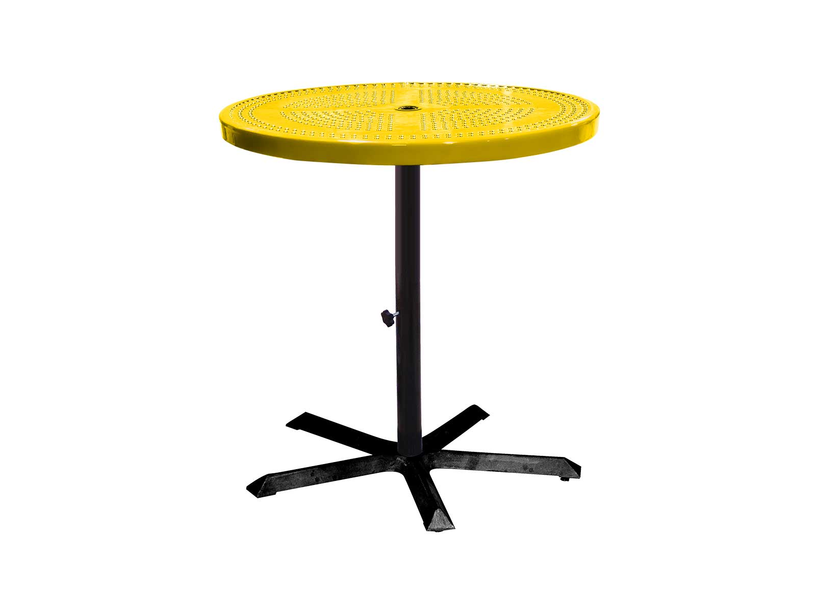 Leisure Craft makes pedestal tables from perforated or expanded metal, in two sizes: 24" & 36" diameters. Two heights are available: 30" high for our C1-PERF chairs and 40" high for our C2-PERF bar height chairs. There is a collar to place an umbrella on 36" tables with a knob to secure it with. It has 11 gauge (perforated) or 9 gauge (expanded) steel construction with a cast-iron pedestal base in 18 thermoplastic colors.