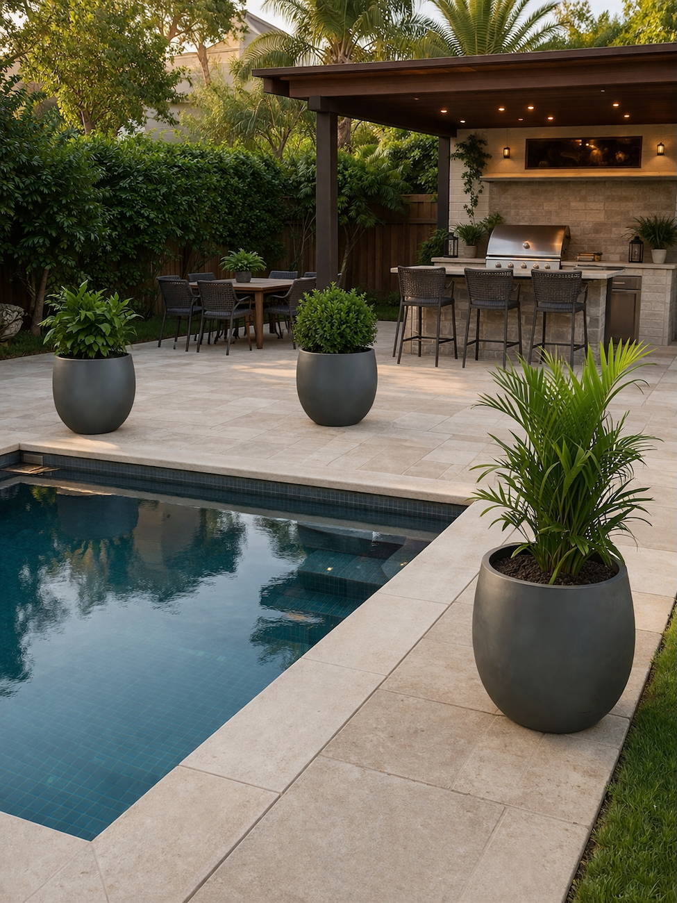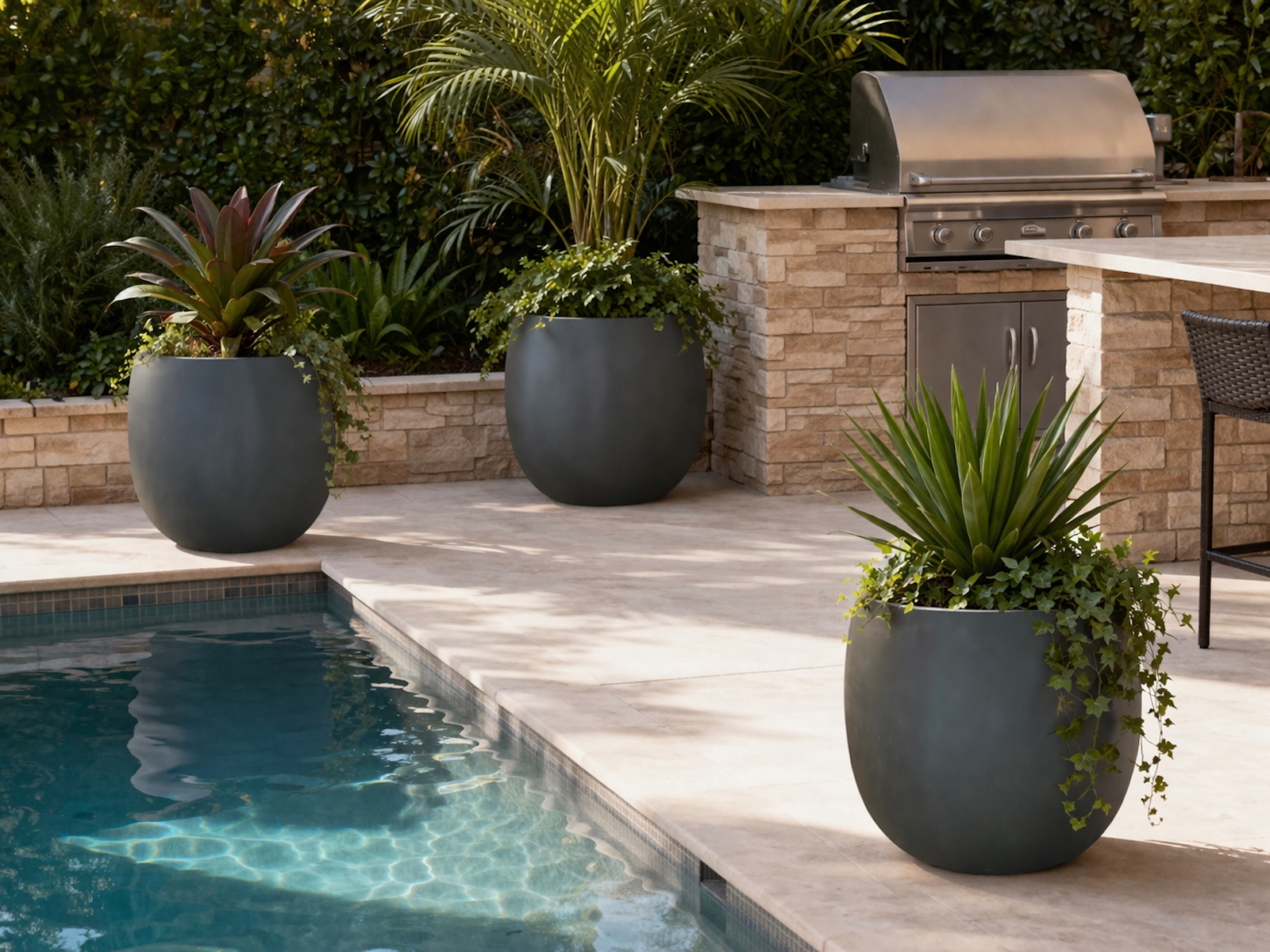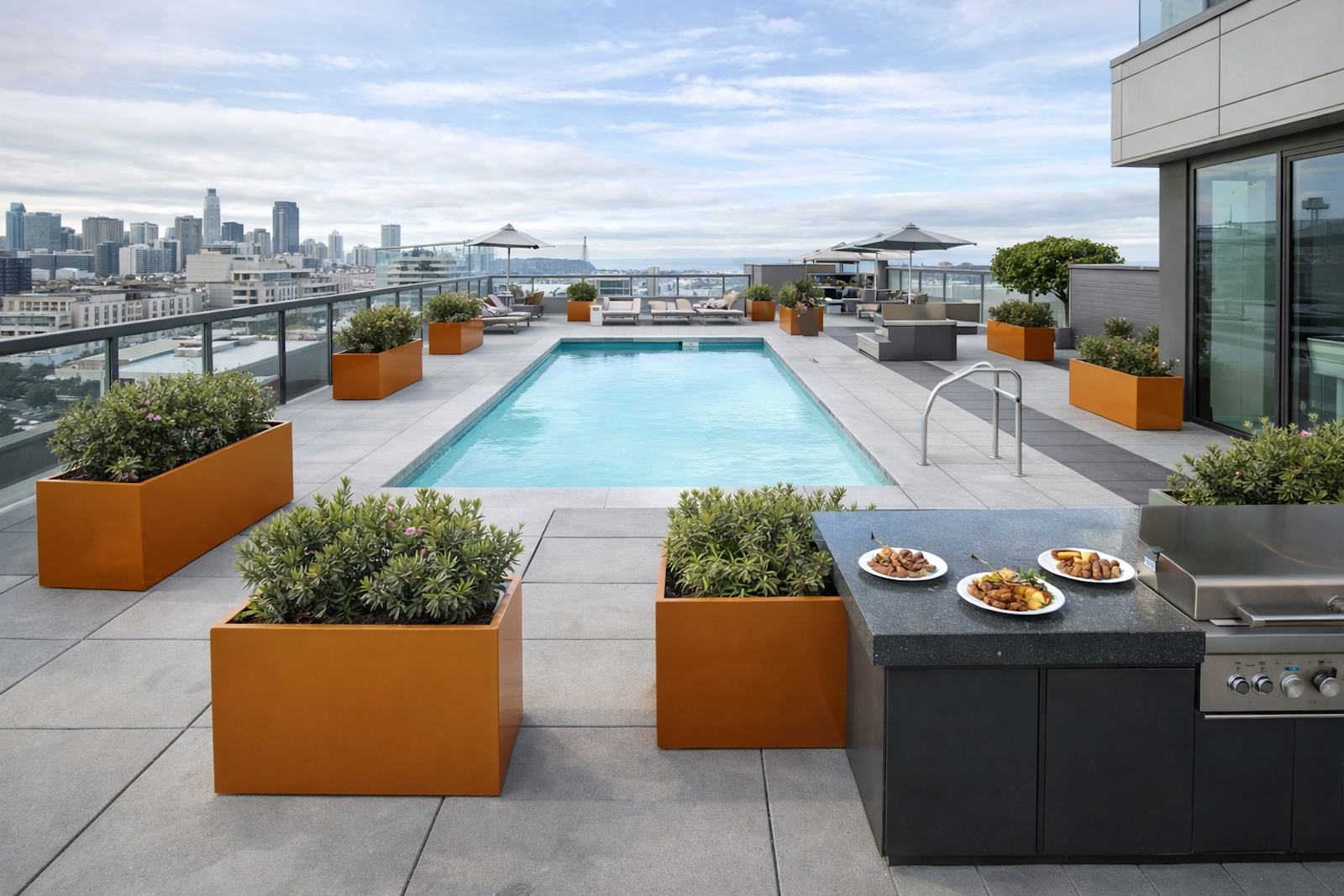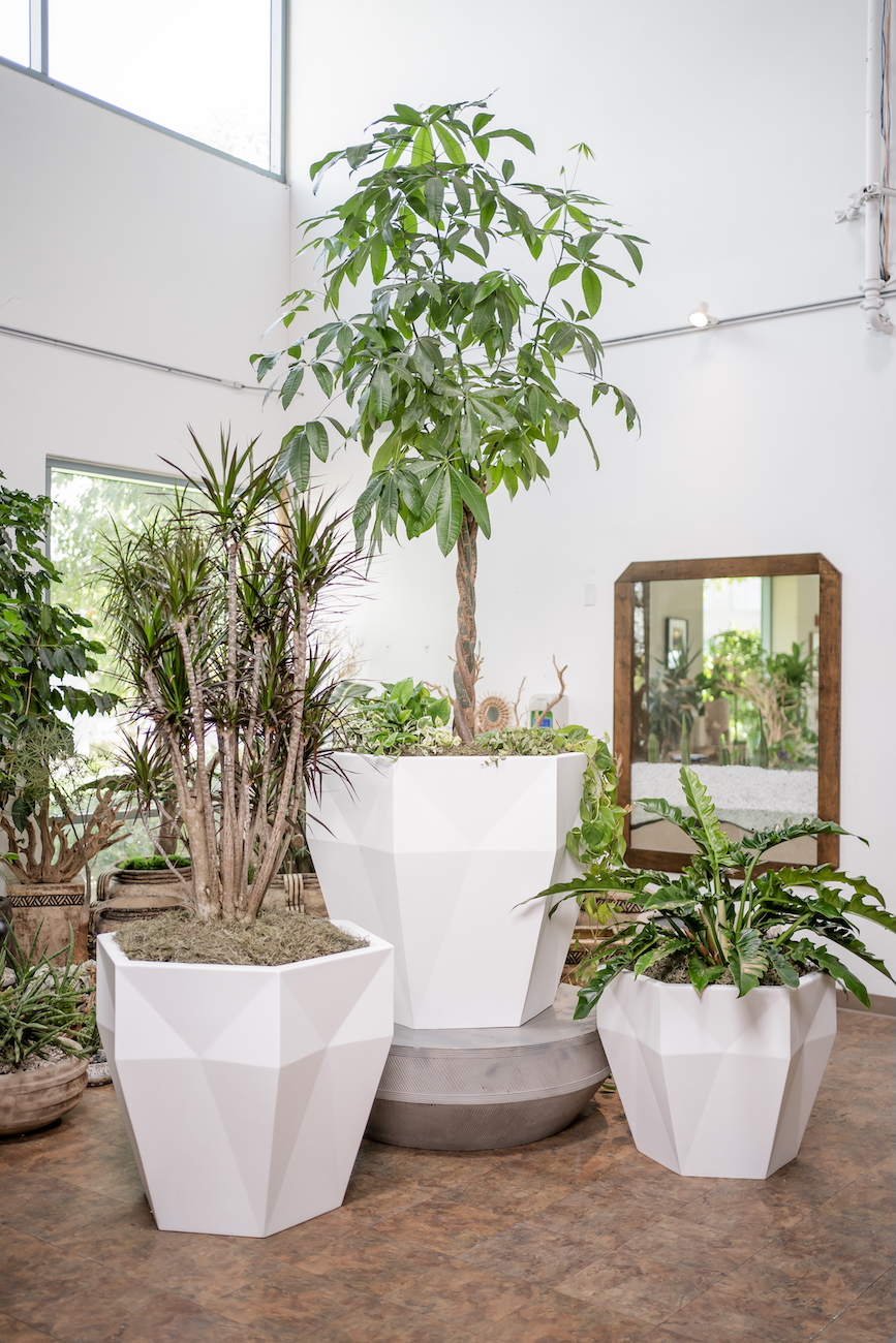 The Chandler Company delivered a series of contemporary rectangle fiberglass planters with a smooth pearl finish to help make a Beverly Hills bank building look more appealing.