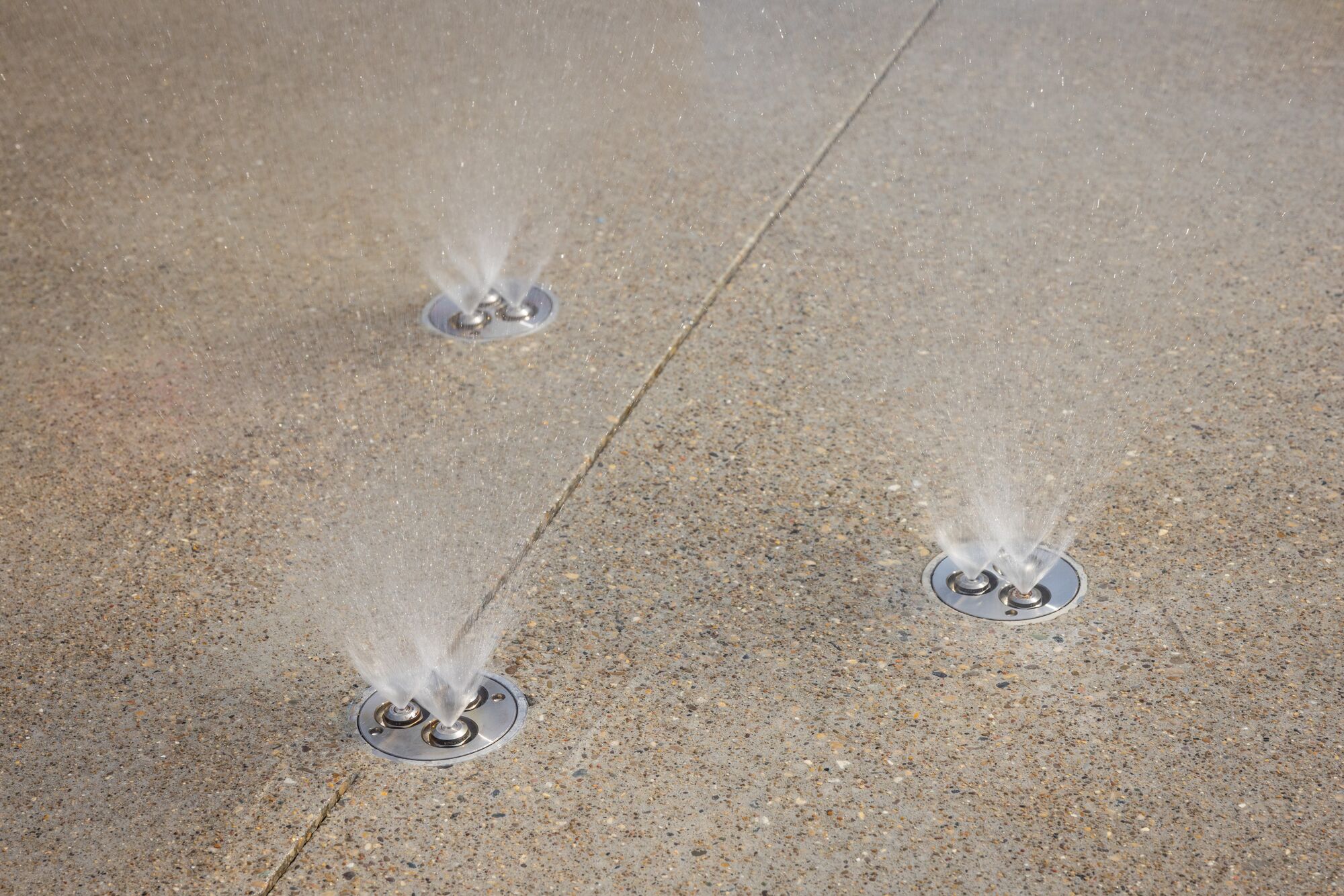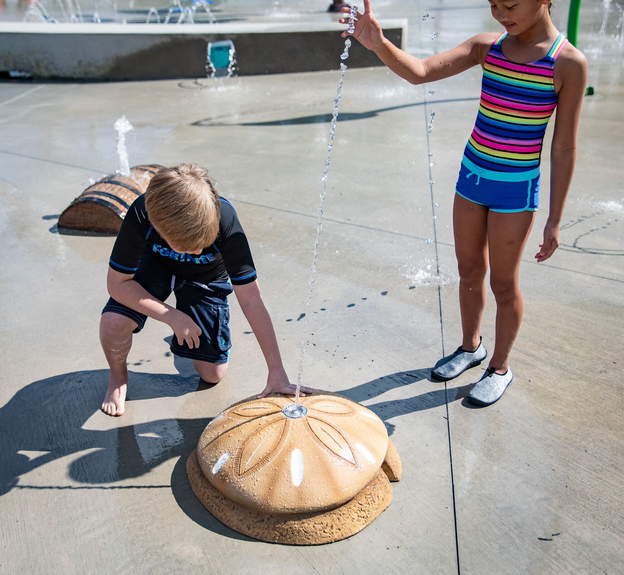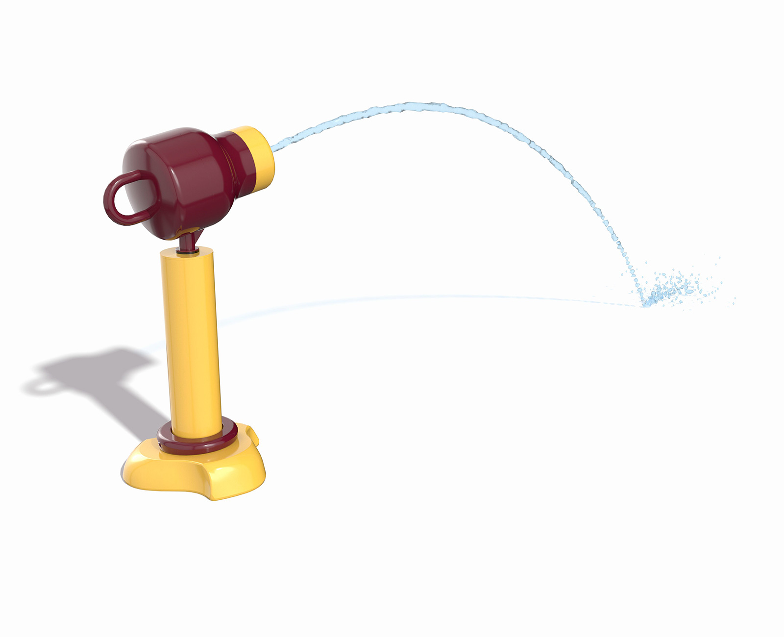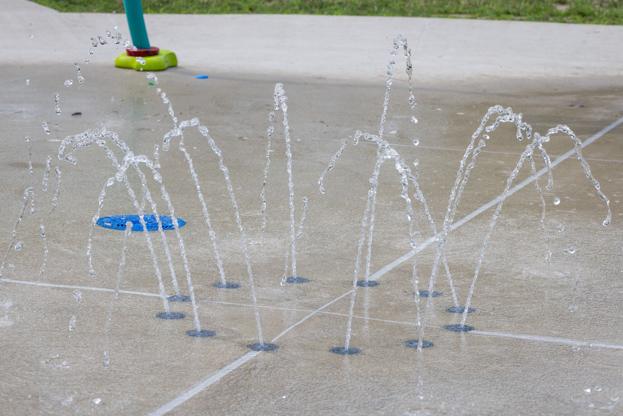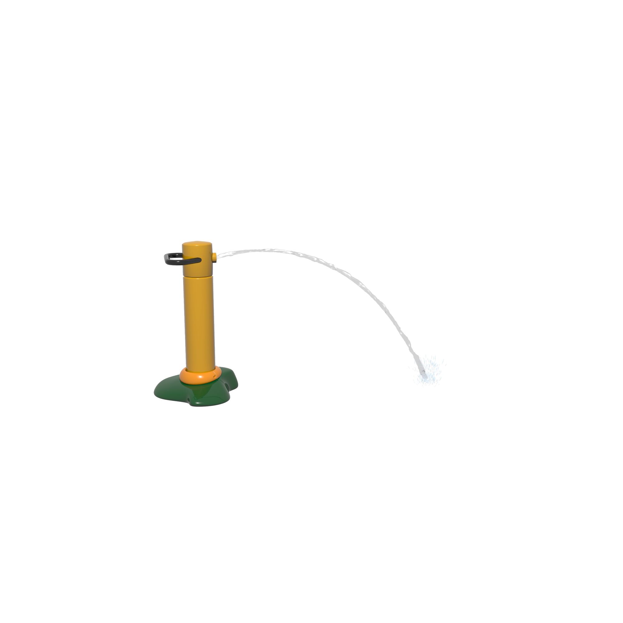 The Center Pillar Ring is a ground spray element that emits twelve (12) vertical streams of water from a 3ft diameter ring. In the center is a single stream jet spraying 5ft upwards. Users work together to plug the outer jets with hands and feet, resulting in the center jet spraying higher. The Center Pillar Ring is designed for wet deck applications with no standing water. Users can work together to plug holes and create larger water flow through the unplugged holes. The Center Pillar Ring promotes streaming, manipulative, and interactive tactile experiences.