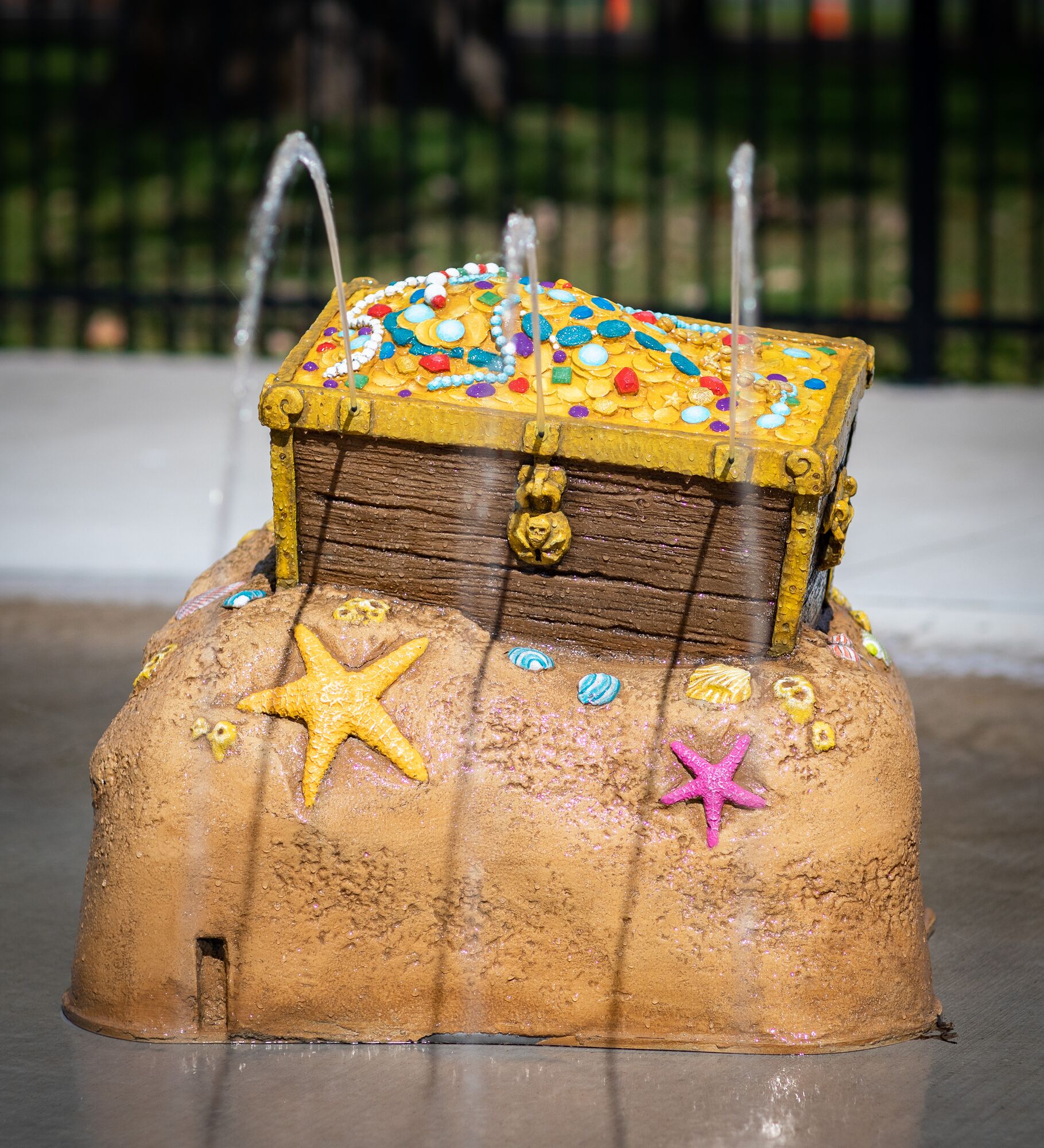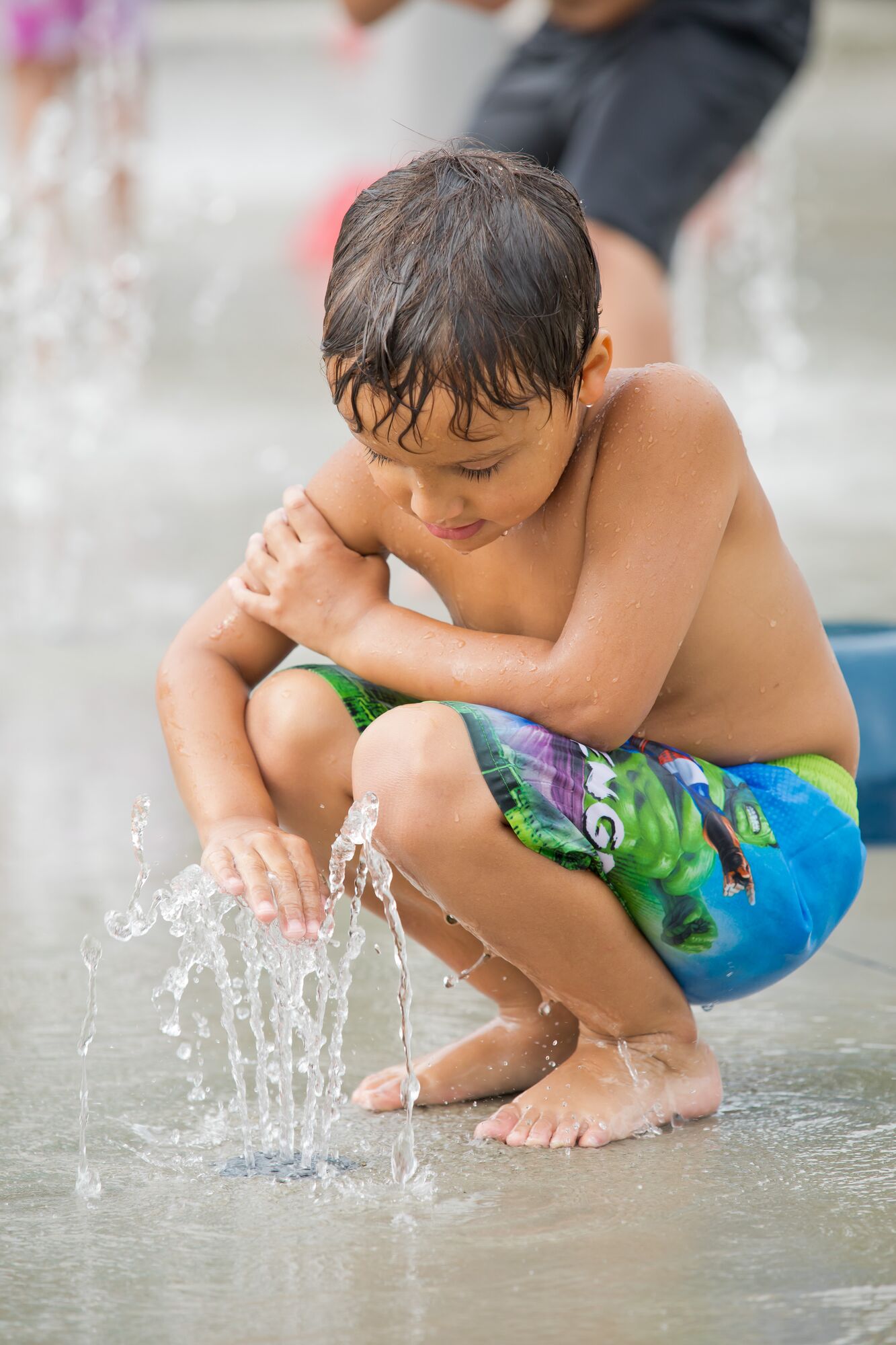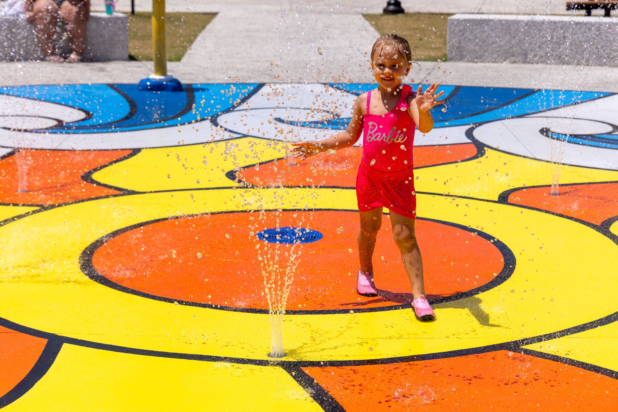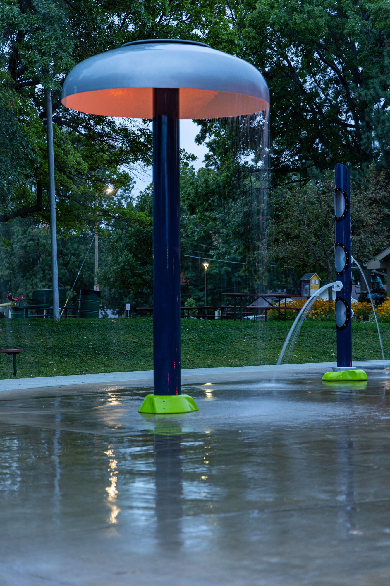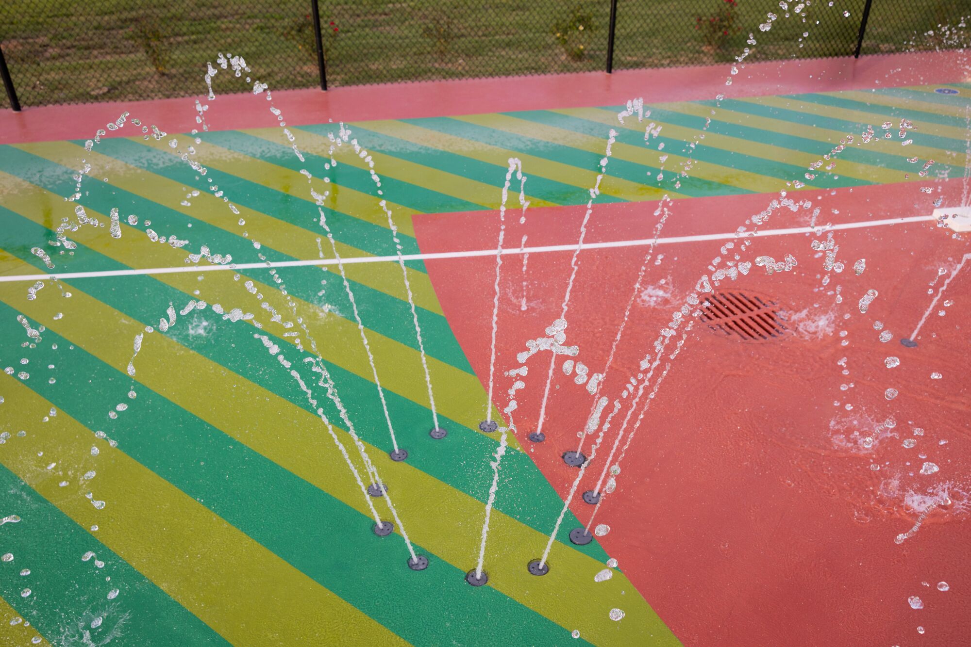 The Center Pillar Ring is a ground spray element that emits twelve (12) vertical streams of water from a 3ft diameter ring. In the center is a single stream jet spraying 5ft upwards. Users work together to plug the outer jets with hands and feet, resulting in the center jet spraying higher. The Center Pillar Ring is designed for wet deck applications with no standing water. Users can work together to plug holes and create larger water flow through the unplugged holes. The Center Pillar Ring promotes streaming, manipulative, and interactive tactile experiences.