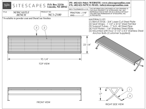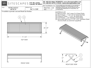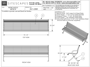 The New Castle NC1-1000 uses horizontal straps and laser cut steel plate ends for it's backed bench design. This bench is heavy duty and stands up to any enviroment.
