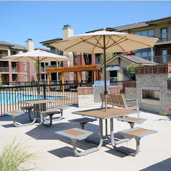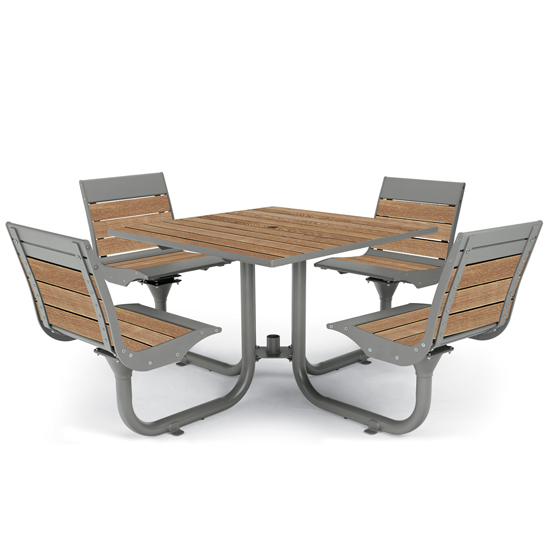 42″ square table top accommodates up to a 1 1/2″ diameter umbrella pole