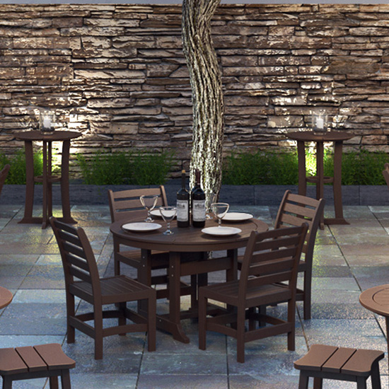 The Laguna Tables and Maywood seating options welcome you to comfortable outdoor seating that is maintenance free.