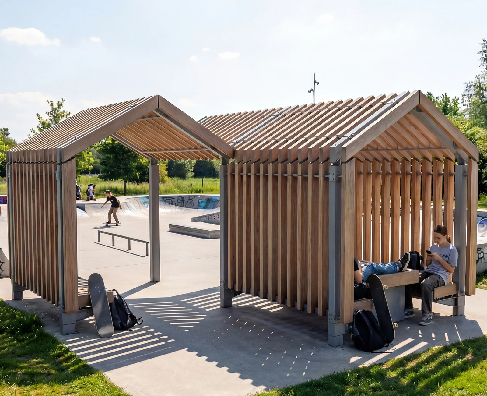Like the Wild Grass Pillars, the Wild Grass Shades are artificial tree structures made of Corten or powder-coated steel, fitted with a circular roof that creates pleasant, shaded spaces. Multiple shades can be placed next to each other to form larger shaded areas. The structures can be easily combined with various Benches from the Streetlife Collection, creating a cohesive streetscape. The open structure creates a spacious effect and maintains sightlines, while at the same time providing shelter from the sun and heat. The Shades are 118" high and the circular roof has a diameter of 130".