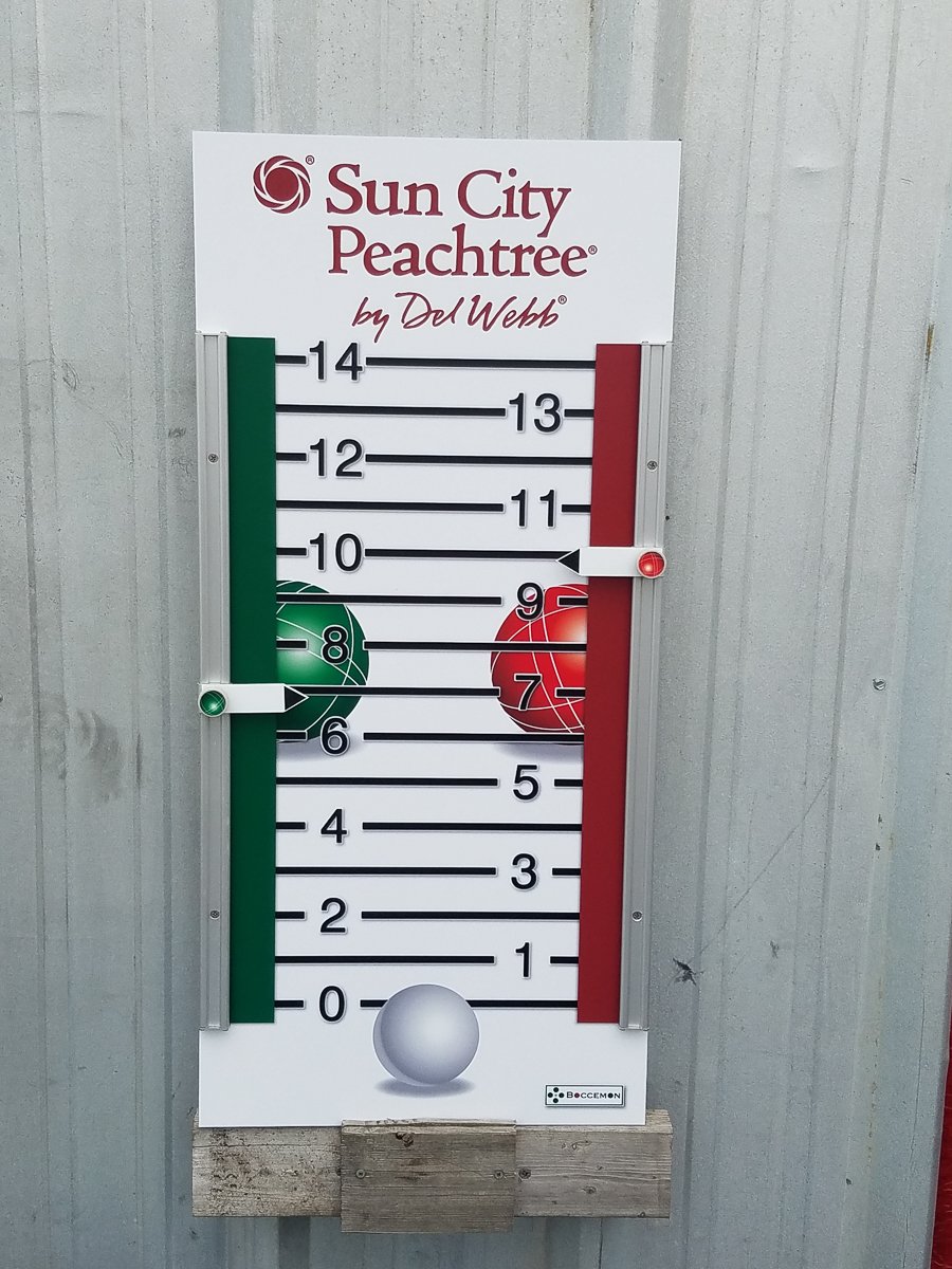 This scoreboard was built with serious Bocce players in mind. Aluminum signboard mounts easily to a 2" pipe. Excellent visibility for players and spectators. Ideal for all weather conditions. No maintenance. Price for a single-faced board, with logo (Artwork to be supplied by customer) and graphics is $355 for a standard rectangular board, and $430 for a routered board (please click for examples). which includes shipping and handling to the lower 48. Scoreboard only.