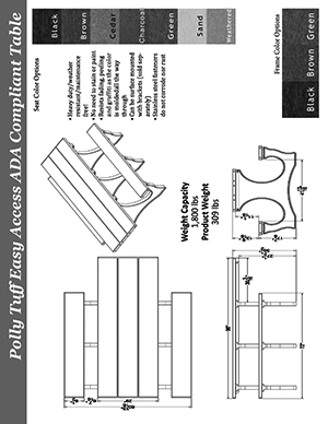 The Polly Tuff Easy Access Table uses three structurally engineered, one-piece proprietary leg frames molded solid from recycled plastic. It is the easiest to assemble, and the low frame profile allows easy access to seats, which also makes it ideal for those with limited mobility. The Polly Tuff Easy Access Table is available in 6 ft. and 8 ft. lengths as well as an ADA Compliant option with an 8 ft. table-top and 6 ft. benches. All are made with heavy-duty 2" x 10" recycled plastic lumber for strength and durability.