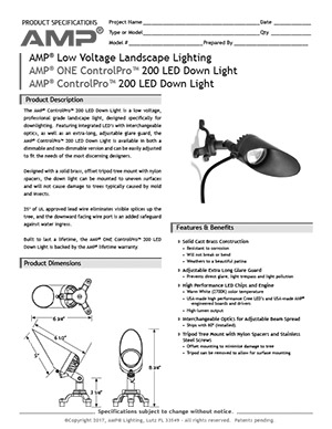 The AMP® ONE G2 Control Pro™ LED Down Light is a low voltage, professional grade landscape light, designed specifically for downlighting. Due to our revolutionary wire-exit design this fixture is guaranteed to never experience water intrusion. Featuring dimmable, integrated single source LED with interchangeable optics, as well as an extra-long, adjustable glare guard, the AMP® ONE G2 Control Pro™ LED Downlight can be easily adjusted to fit the needs of the most discerning designers. Designed with a solid brass, offset tripod tree mount with nylon spacers, the down light can be mounted to uneven surfaces and will not cause damage to trees typically caused by mold and insects. Its toothed knuckle allows for a lifetime of precision aiming. 40' of cUL approved lead wire eliminates visible splices up the tree, and the downward facing wire port is an added safeguard against water ingress. The AMP® ONE G2 ControlPro™ 200 LED Downlight uses a single source LED to produce crisper shadows, allowing for a more professional lighting effect. The 350-lumen output makes this light ideal for moonlighting effects and accent lighting from under eaves and other overhangs.