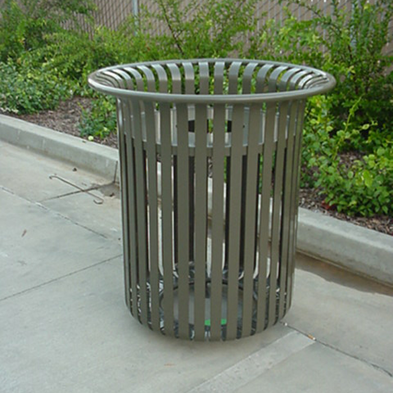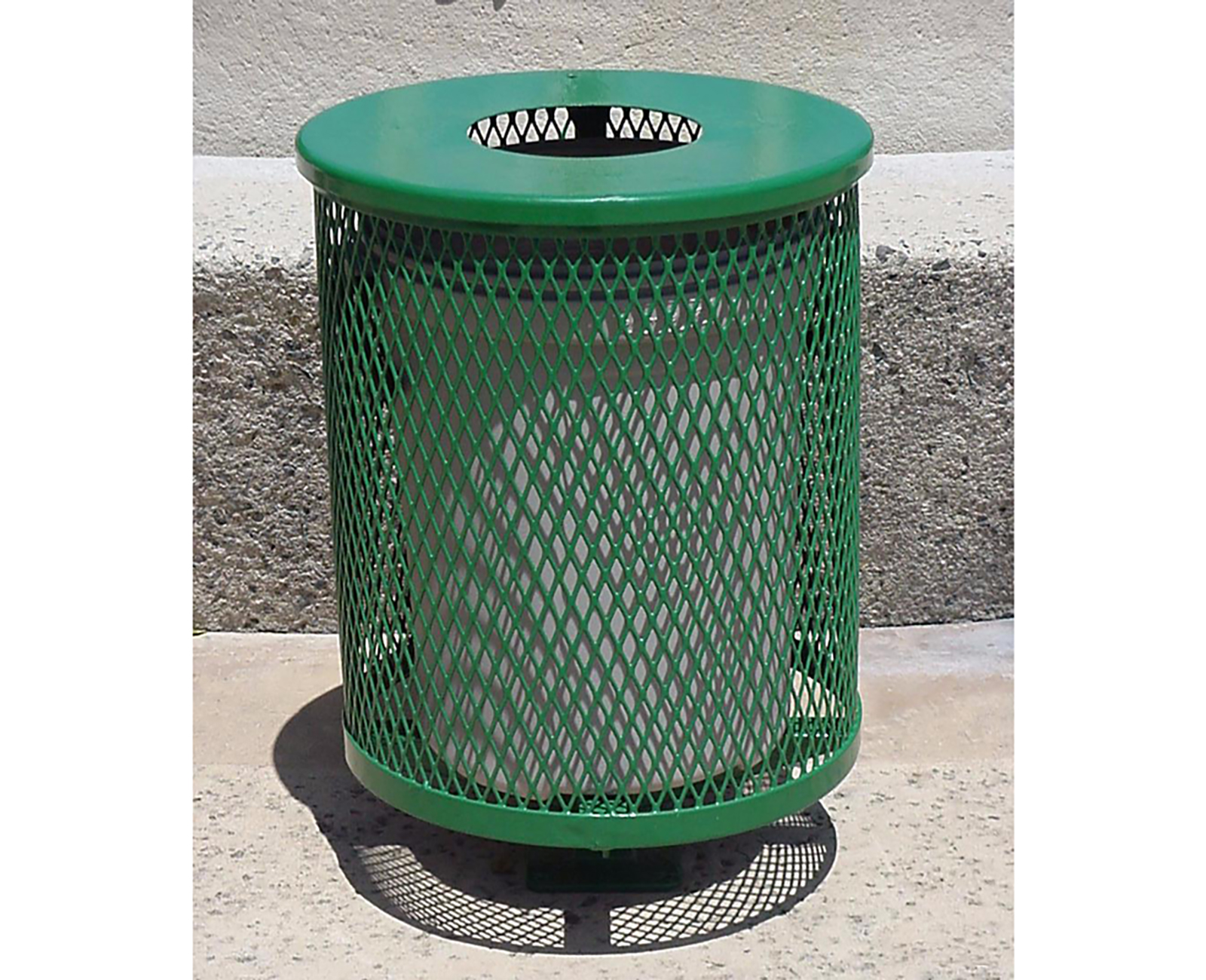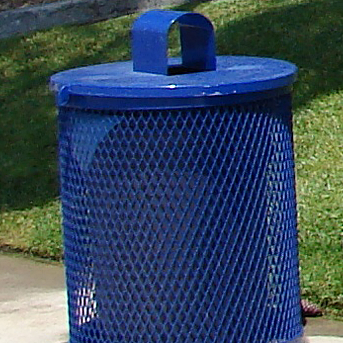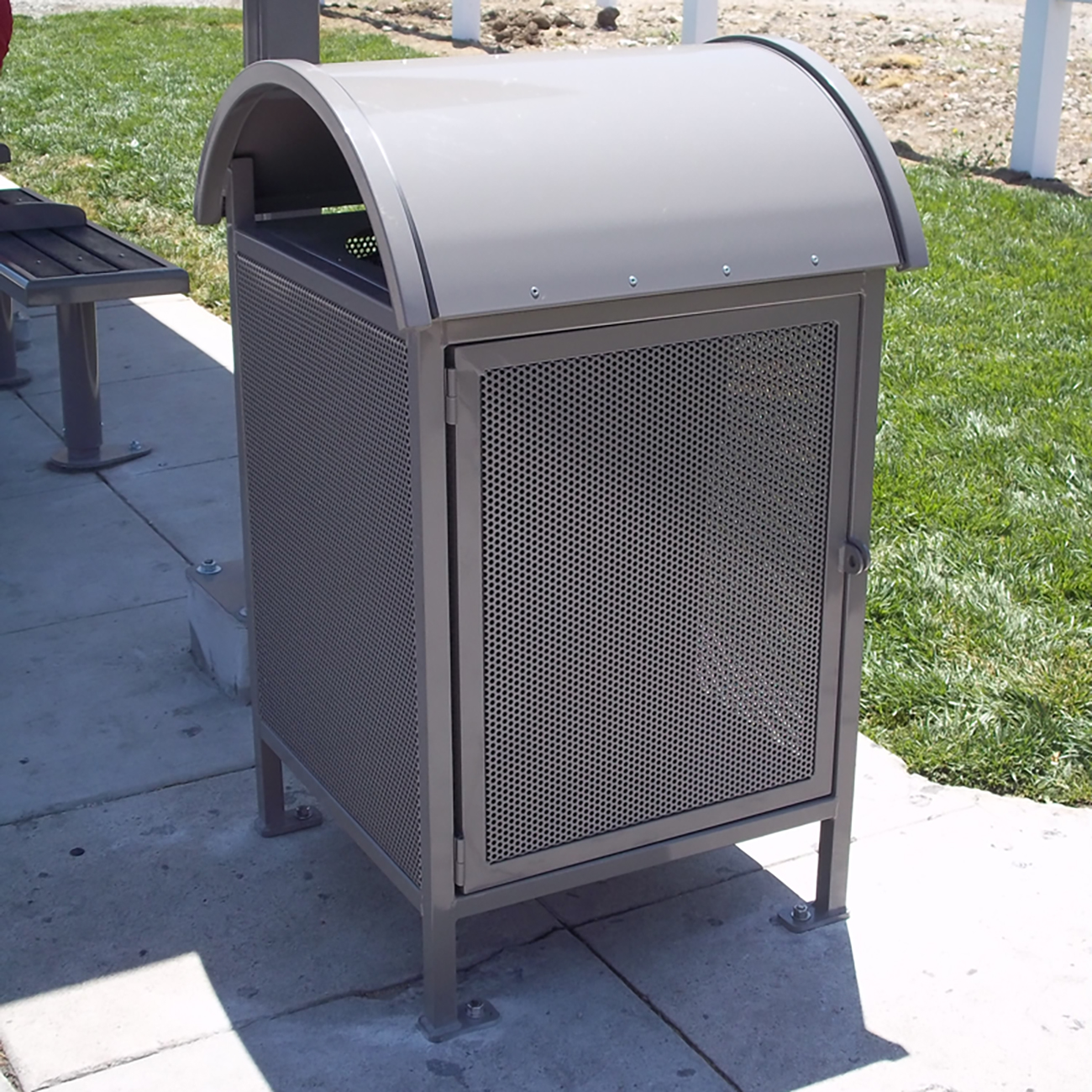 32 gallon square perforated metal trash receptacle with radius dome lid and hard rubber liner. Includes hinged door for ease of liner removal.