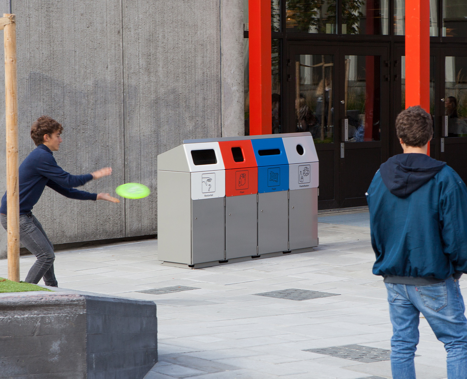 URBAN recycle is available as a free-standing recycling point (3x80 litres), a free-standing bin with an opening on each side (2x70 litres) or a row of bins for wall mounting (100 litres each).