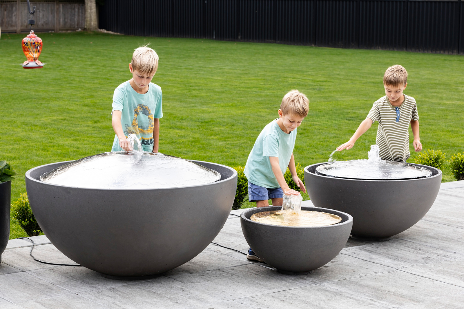 Our 26'' water dome is often described as providing a "wee tinkle" in the garden, offering beautiful sounds and a lovely aesthetic. These bowls feature polished metal domes that appear to float within concrete vessels. Water flows up through the center of the dome, cascades over the reflective, hand-spun metal surface, and then drops into the surrounding water, creating light and flowing sound. Each metal dome is handmade and unique, with variations and undulations characteristic of hand-spun metal that create beautiful water movement and reflections. The 26 inch fountain is a perfect hemispherical concrete bowl available in twelve colors with either a brass or stainless steel dome. It comes with a pump and a 10-foot cable; you only need to provide an electrical point. A self-circulating water feature available in three sizes with stainless steel or brass.