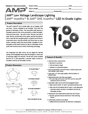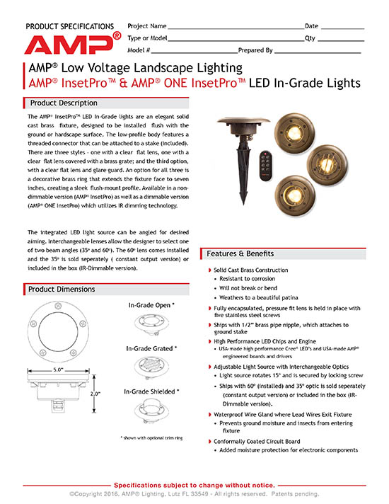 With AMP® ONE IR dimming technology, this elegant integrated LED solid cast brass fixture is designed to be installed flush with the ground or hardscape surface. Its low-profile body features a threaded connector that can be attached to a stake (included). The AMP® ONE InsetPro LED In-Grade Light uses a 2″, 3-LED array to produce a beam of bright "warm white" light with even distribution and soft edges. The 375-lumen (35W equivalent) output makes this light ideal for illuminating walls, columns, and plant material.