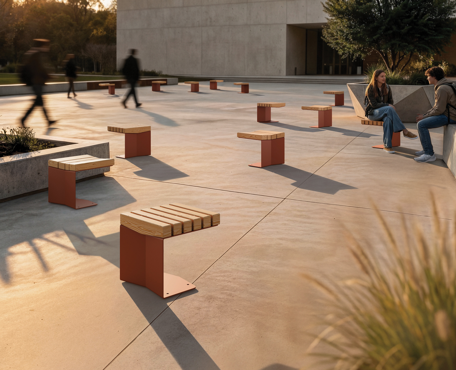 Brutalist-inspired strength meets human comfort in the Blox Bench Series—where bold geometric angles and a Douglas Fir seat create an intentional and welcoming anchor for modern urban landscapes.