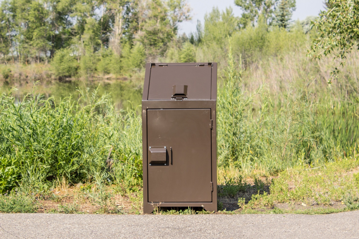 Designed to enclose a 32-gallon round trash liner, included. The access door is equipped with a bear resistant, ADA compliant paddle latch that locks into place when the door is released preventing the door from being left open. Custom logo available and your choice of color.