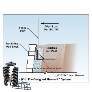 Strata Systems is the exclusive manufacturer of the Sleeve-It Product. Fence integration issues often arise after the construction of a segmental retaining wall (SRW). This occurs because fence structures cannot be installed in a traditional manner at the top without affecting the integrity of the wall systems components. The Sleeve-It 1224R is a pre-engineered post foundation solution that creates a structural cavity in the soil during wall construction. Once the wall is complete the fence installer simply pops the lid and sets the post in concrete. The product has been designed and field tested for code compliance to the IBC Section 1013. Visit us at www.geogrid.com and see why many SRW industry insiders are calling the Sleeve-It 1224R a system within the system and not just an accessory. Utilizing the latest technology Strata Systems is the manufacturer and worldwide distributor of Stratagrid StrataTex StrataDrain StrataWeb cellular confinement system and the Sleeve-It System. These advanced soil reinforcement products are utilized in MSE retaining walls reinforced steep slopes and embankments over soft soils.