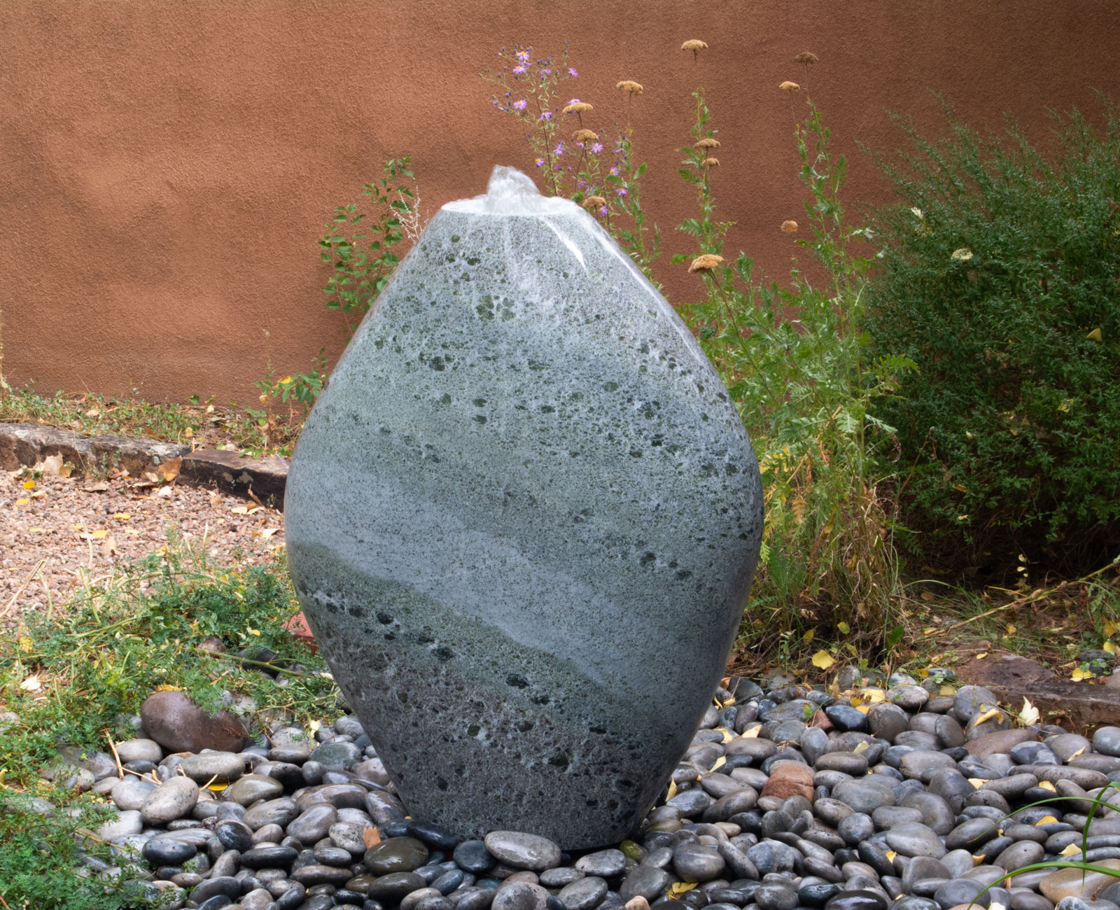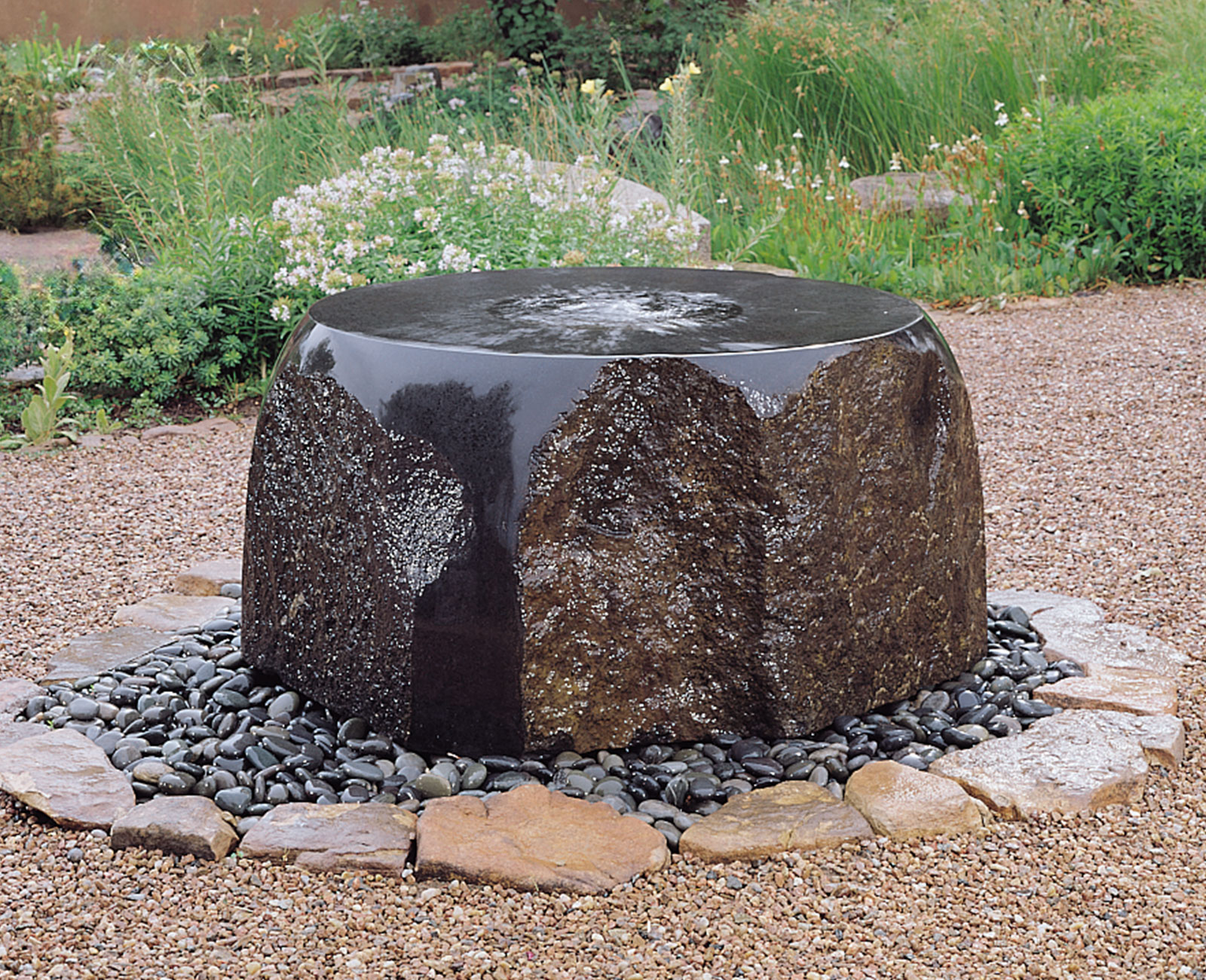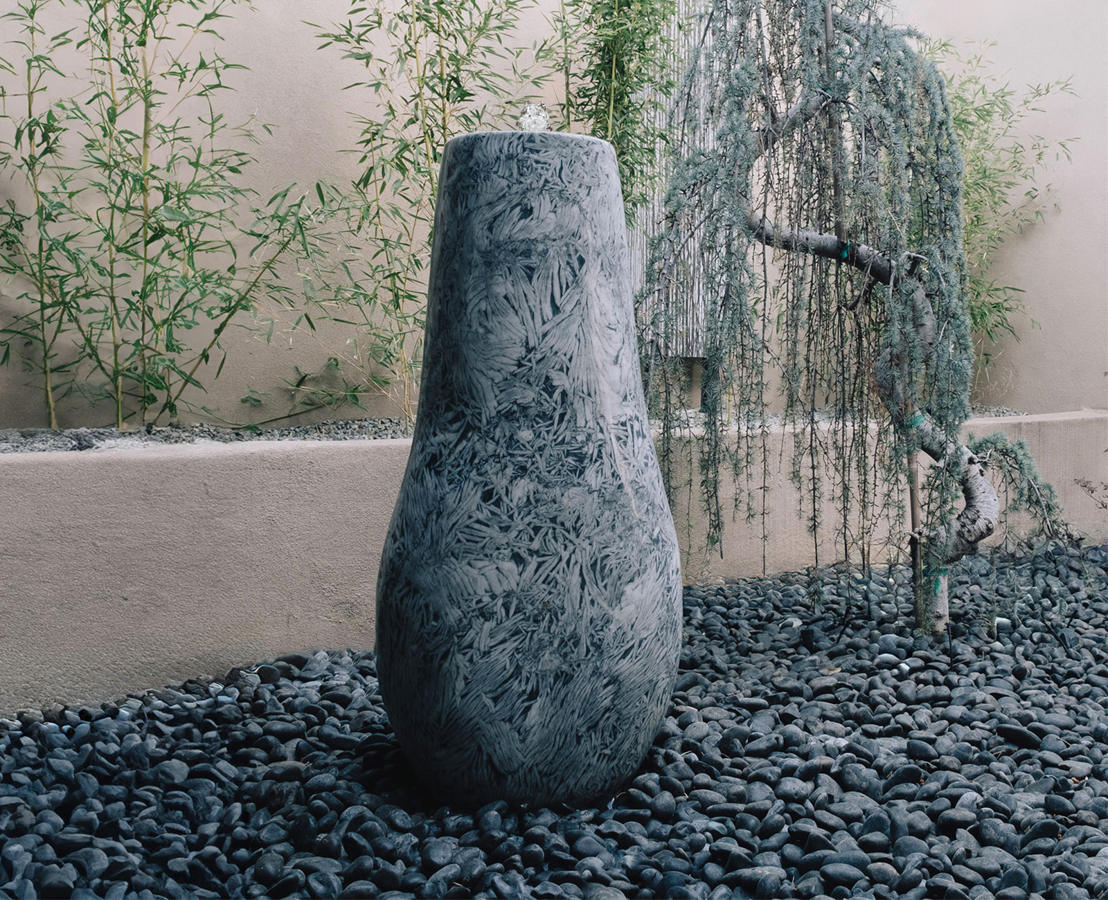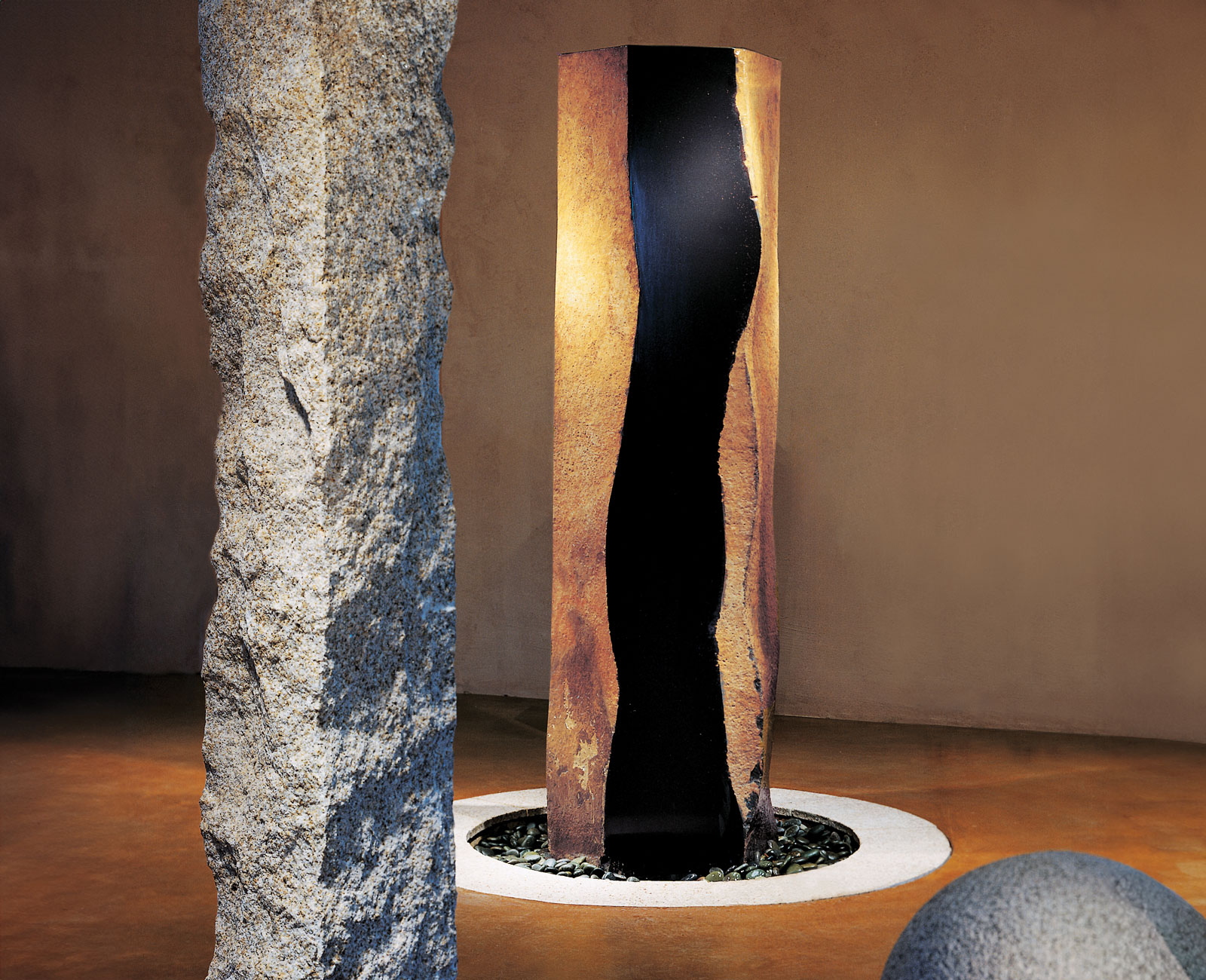 We begin with a massive basalt boulder that has weathered for millions of years under environmental exposure. The exterior of the fountain alternates the natural surface of the boulder with highly polished facets, providing a dramatic play of textures accentuated by the cascade of water.