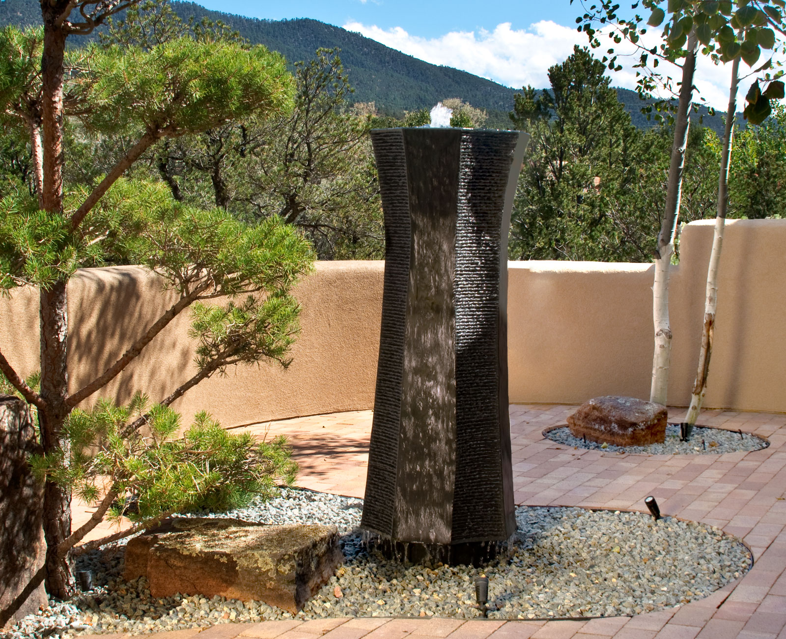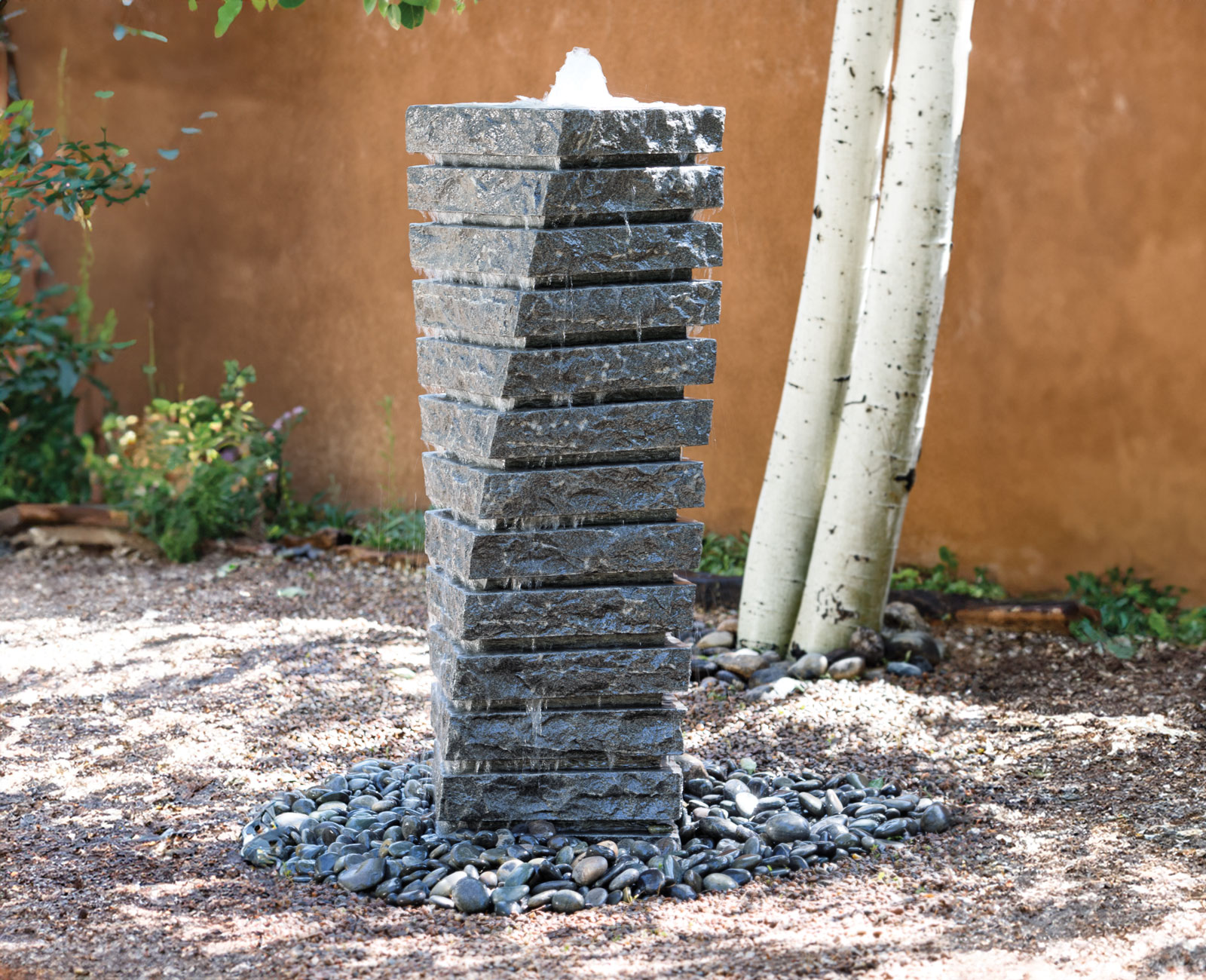 This black granite garden fountain features delicate, polished curves and a contrasting ribbed texture.