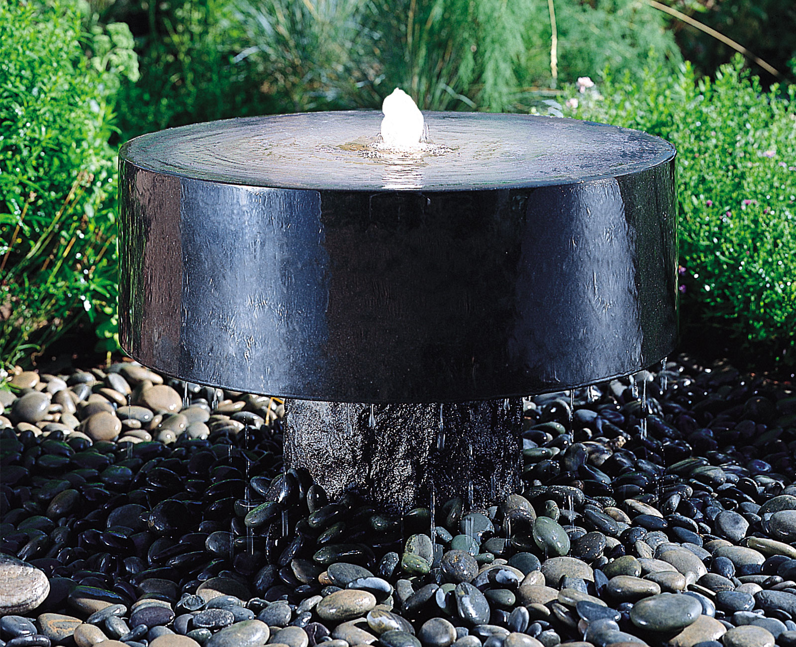 This striking black Polished Millstone Fountain is carved from Black Granite. The millstone is highly polished while the pedestal has a contrasting chilseled finish.