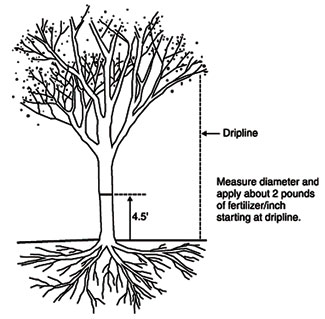 Another method of fertilizer calculation is to measure the trunk diameter of the tree at 4.5 feet above ground level. With this method, about 2 pounds of a complete fertilizer containing 10 to 20 percent nitrogen should be used for each inch of trunk diameter.