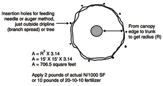 The area to be fertilized under a tree canopy forms a circle. To calculate the square footage, take the radius squared X 3.14. Suppose a tree has a spread of 30 feet. This would equal 706 square feet that would be considered for fertilizer application. To get 2 pounds of actual nitrogen per 1,000 square feet over that area, 1.4 pounds would be needed (706/1000 x X/2 = 0.7×2X = 1.4). If the percent nitrogen in the fertilizer is 10, then 20 pounds of that material would be needed; if the percentage is 5, then 40 pounds; if the percentage of nitrogen is 20, then only 10 pounds, etc.