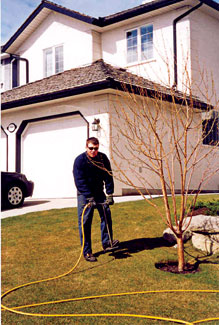 Using a hose-attached root feeder will get the material into the root zone in a liquid form. Water flows past pre-measured tablets in an enclosed chamber and passes through a hollow needle inserted into the soil about 8 to 12 inches deep. Make sure to equally distribute the material to each of the holes.