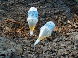 A capsule containing the desired chemical is attached to this feeder tube to allow the material to enter the tree. It is low pressure, with the intent that the tree will ingest the insecticide into its vascular system at its own rate.