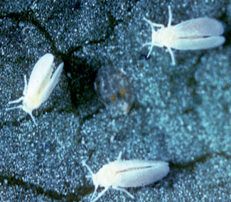 Common Name(s): Greenhouse Whitefly Scientific Name(s): Trialeurodes vaporariorum Crop Hosts: Vegetable and ornamental crops. Identification and Life Cycle: The female deposits more than 100 eggs on the undersides of leaves attached by a short stalk. On hatching, the flat, transparent nymphs settle on the leaf and remain in this situation until they become adults. After 28 to 30 days they form the four-winged, very active adult. Both males and females fly and feed on the underside of the leaves. They live for 30 to 40 days. Under greenhouse conditions, the generations overlap and all stages can be found on infected plants at any time. Affected Areas: Found throughout the United States.