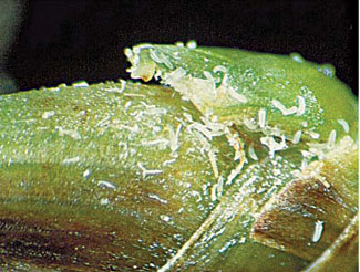 Common Name(s): Bermudagrass Mite Scientific Name(s): Eriophyes Cynodoniensis Crop Hosts: Coarse varieties of bermudagrass such as common, ormond, and St. Lucie Identification and Life Cycle: Extremely small – unable to be seen with the naked eye ?EUR??,,????'??? the mites are yellowish-white, somewhat worm-like in shape, and have two pairs of legs. They are active primarily during late spring and summer, but may be active most of the year the further south you travel. They need 5-10 days to complete their cycle from egg to adult, so there are multiple generations each year. The mites tend to develop between the grass stem and blade sheath, which physically protects them from pesticide contact. They remain for most of their life beneath the grass sheath, and large numbers in all stages of development may be found under infested sheaths. Nearly 100-200 mites (eggs, immatures, and adults) can occur under one leaf. They cannot survive on bermudagrass seeds. Affected Areas: Bermudagrass in the southern US.