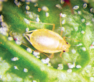 Common Name(s): Green Peach Aphid Scientific Name(s): Myzus persicae Crop Hosts: Stone fruit, potatoes, sugarbeets, garden and flowering plants. Identification and Life Cycle: This aphid overwinters as eggs, and in the spring about the time of peach blossoming they hatch to form young, pale yellowish-green aphids. On becoming full-grown they begin giving birth to living young. There can be 2 to 3 generations on the peach. The adults acquire wings and migrate to garden plants in the late spring. With cold weather, the females fly to the peach, where they give birth to true sexual females. These mate with males that fly over from summer host plants and lay the overwintering eggs. Affected Areas: Found throughout the United States.