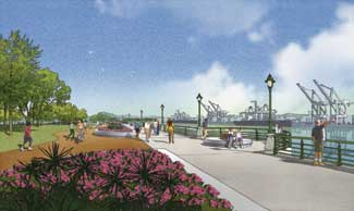 In 1995, the Oakland Army Base was closed and conveyed to the Oakland Base Reuse Authority (OBRA) for re-use. Upon closure of the Base, BMS Design Group worked with OBRA to define a continuous shoreline park and the approximate extent of parcels suitable for waterfront development. The site has spectacular views of San Francisco, Treasure Island and the bay to the west, and up-close views of the Port of Oakland's Seventh Street Marine Terminals.