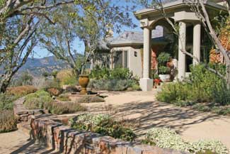 This archly contemporary home, designed by Mexico City?EUR??,,????'???s Ricardo Logoretta (a disciple of Luis Barragan), called for an equally dramatic approach to the landscape. The Chandlers called for thinning the surrounding dense forest so there would be a more apparent sense of place and the opening up of views to the valley below. Once the forest had been edited, Jack discovered the ultimate color of the house in the bark of the many madrones on the property. The landscape is a subtle, almost musical interplay of opposites: huge stone boulders flanked by lilting stems of ornamental grass.