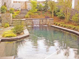 The Hunt home required a Tuscan-style landscape with California influences. The pool in the back garden is designed around the existing native oaks and is situated on an axis with the back windows. The spa is a built-in separate unit off the master bedroom with a sheer descent water feature raised above the patio level.