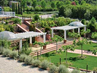 Styled with English and Eastern US traditions, this landscape was designed and built in 3 months. The garden area features custom copper domed pavilions and arbors, massive brick entry columns with substantial iron gates and fencing. Roses, fruit trees, and perennials can be found throughout the garden, while twin bocce courts are located on the lawn area. Trees and ornamental grasses line the driveway along with terraced slopes.
