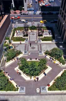 This plaza, a roof garden over a parking structure that is flush to the pedestrian paths, is designed to give maximum seating to noon-time users in a variety of intimate spaces. The plaza allows pedestrian flow through the space to the building entrances. The soil depths in the plaza are 18-24 inches deep to decrease the roof deck loads. Hedges structure the zones for perennials. Geometric planting areas are surrounded by seat walls.