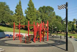 This park remodel was centered on the concept of cars, driving and racing. The play area is nestled into the hillside within an existing curved retaining wall. The concrete wall became a ?EUR??,,????'??Hot Wheels?EUR??,,????'?? track while the play area was surrounded by a recreated ?EUR??,,????'??LeMans?EUR??,,????'?? styled racing track. An operable street light is started in true drag racing fashion by pushing the crosswalk button nearby. Custom colored concrete benches resembling wide tracked cars or trucks were created for seating. Inexpensive, recycled metal trash cans were covered with recycled tires. Simulated exhaust pipes signal the beginning of the race track while flames and smoke are recreated within the resilient play paving.