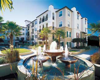 This luxury resort featuring four levels of townhouses, condominiums and penthouses surrounding central courtyards was built above a two-level parking garage. Because of this, the entire landscape had to be created from scratch. Keeping in mind that many people choosing to live here gave up a more suburban lifestyle with private backyards, small, private patios were designed as a part of each ground level home. For people living above the ground floor, alternative spaces throughout the site provided places of retreat and privacy, including areas with secluded benches and intimate wall fountains