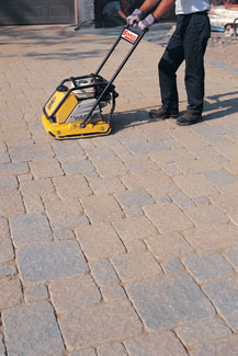 As moisture activates the polymeric binder, ensure the pavement is dry prior to application, with no rain in the forecast for 24 hours. Sweep additional sand as needed until the joints are full to the bottom of the chamfer or to a uniform depth of 1/8th of an inch below the surface of a non-chamfered paver. Filling above this level diminishes the pavement?EUR??,,????'???s ability to channel water and exposes the sand to excessive abrasion from traffic. Additional passes with the plate compactor may be necessary, as tighter compaction results in greater stability and stronger polymeric bonds. When the joints are full, sweep the pavement clean of excess sand and blow off remaining residue with a leaf blower. Keep the leaf blower above knee height and at a shallow angle to avoid displacing sand from the joints.